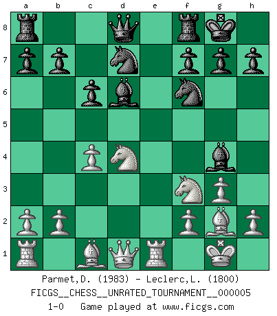Last move : 1-0 2010 February 16 13:40:21 [Event "FICGS__CHESS__UNRATED_TOURNAMENT__000005"] [Site "FICGS"] [Date "2010.01.21"] [Round "1"] [White "Parmet,Daniel"] [Black "Leclerc,Luc-Olivier"] [Result "1-0"] [WhiteElo "1983"] [BlackElo "1800"] 1.e4 c6 2.d3 d5 3.Nd2 e5 4.Ngf3 Bd6 5.g3 Nf6 6.Bg2 O-O 7.O-O Be6 8.d4 Nbd7 9.exd5 Bxd5 10.c4 Be6 11.Re1 exd4 12.Nxd4 Bg4 13.N2f3 1-0 Caro-Kann : Closed (Breyer) variation Kingside Castling by player Black (move 6) Kingside Castling by player White (move 7) Player White won this chess game. Follow this game move after move (download)The older I grow, the more I value Pawns. (Keres) Die jungen Leute sollen verstehen, dass sie noch etwas von mir lernen können und müssen. (Viktor Kortschnoi) Aún deseo matar a Fischer. (Boris Spassky) Le jeu d'échecs est comme rejeté hors du temps. (Antoine de Saint-Exupéry) Creativity is allowing yourself to make mistakes. Art is knowing which ones to keep. (Scott Adams)