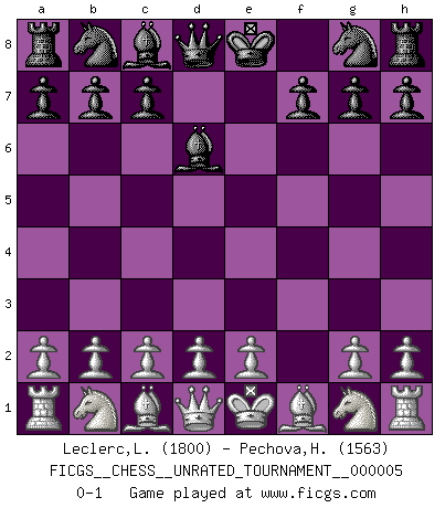 Last move : 0-1 2010 April 2 8:26:13 [Event "FICGS__CHESS__UNRATED_TOURNAMENT__000005"] [Site "FICGS"] [Date "2010.01.21"] [Round "1"] [White "Leclerc,Luc-Olivier"] [Black "Pechova,Hana"] [Result "0-1"] [WhiteElo "1800"] [BlackElo "1563"] 1.f4 e5 2.fxe5 d6 3.exd6 Bxd6 0-1 This chess game has been lost on time (started : 2010.01.21 0:17:47) Bird : From gambit Player Black won this chess game. Follow this game move after move (download)I played Chess with him and would have beaten him sometimes only he always took back his last move, and ran the game out differently. (Mark Twain) Im Schach nämlich geht es darum, daß Ich des Gegners klein zu kriegen, sein Ego zu zerbrechen und zu zermahlen, seine Selbstachtung zu zertreten und zu verscharren und seine ganze mißachtenswerte sogenannte Persönlichkeit ein für alle Mal tot zu hacken und zu zerstampfen und dadurch die menschliche Gesellschaft von einer stinkenden Pestbeule zu befreien. Es ist ein königliches Spiel. (Robert James Fischer) Debemos de asegurarnos de que el Ajedrez no se convierta en un lenguaje muerto, muy interesante, pero tan solo para un grupo muy pequeño. (Sytze Faber) On peut tirer plus d'utilité d'une partie perdue que de 100 parties gagnées. (Capablanca) Don't anthropomorphize computers - they hate it. (Anonymous)