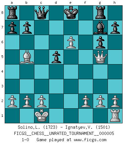 Last move : 1-0 2010 February 7 18:20:2 [Event "FICGS__CHESS__UNRATED_TOURNAMENT__000005"] [Site "FICGS"] [Date "2010.01.21"] [Round "1"] [White "Solino,Leonardo"] [Black "Ignatyev,Vladimir"] [Result "1-0"] [WhiteElo "1723"] [BlackElo "1501"] 1.e4 e5 2.Nf3 d6 3.d4 f5 4.dxe5 fxe4 5.Ng5 d5 6.e6 Nh6 7.Nc3 c6 8.Ngxe4 dxe4 9.Qh5+ g6 10.Qe5 Rg8 11.Bxh6 Bxh6 12.Nxe4 Bg7 13.Nd6+ Ke7 14.Nxc8+ Qxc8 15.Qc5+ Ke8 16.O-O-O Na6 17.Qg5 Nc7 18.Bc4 Nd5 19.Rxd5 cxd5 20.Bb5+ 1-0 Philidor : Philidor counter-gambit, del Rio attack Queenside Castling by player White (move 16) Player White won this chess game. Follow this game move after move (download)In complicated positions, Bobby Fischer hardly had to be afraid of anybody. (Paul Keres) Wenn du auf das Glück wartest, wird das Leben ziemlich langweilig. (Mikhail Nekhemyevich Tal) Para mi, el Ajedrez es la vida y cada partida es como una nueva vida. Todo jugador de Ajedrez suele vivir muchas vidas durante su vida. (Eduard Gufeld) Les écrivains ont utilisé les échecs pour analyser les côtés extrêmes de la nature humaine. Dans ce cadre, les échecs offrent un champ d'expérimentation idéal. Mais on pourrait faire la même chose avec la peinture. Et là, en vous référant à Van Gogh, vous ne tirerez pas de conclusion définitive sur les peintres. (Gary Kasparov) As the days dwindle down... to a precious few. (Maxwell Anderson)