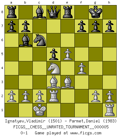 Last move : 0-1 2010 February 3 7:40:18 [Event "FICGS__CHESS__UNRATED_TOURNAMENT__000005"] [Site "FICGS"] [Date "2010.01.21"] [Round "1"] [White "Ignatyev,Vladimir"] [Black "Parmet,Daniel"] [Result "0-1"] [WhiteElo "1501"] [BlackElo "1983"] 1.e4 e5 2.f4 Bc5 3.Nf3 d6 4.d4 exd4 5.Nxd4 Nf6 6.Nc3 O-O 7.Be3 Re8 8.Bd3 Bb6 9.Qd2 d5 10.e5 c5 11.Nce2 cxd4 12.Nxd4 Ne4 13.O-O-O Nxd2 14.Rxd2 Nc6 0-1 KGD : Classical variation Kingside Castling by player Black (move 6) Queenside Castling by player White (move 13) Player Black won this chess game. Follow this game move after move (download)When I have White, I win because I am white; When I have Black, I win because I am Bogolyubov. (Bogolyubov) Schach ist Krieg, im Schach geht es um testosterongesteuerte Urschreie. (Garry Kasparov) El Ajedrez es sobre todo, ¡una pelea!. (Emanuel Lasker) Il a essayé de se convaincre qu'il pourrait empêcher toutes les erreurs et ne jamais perdre. L'horreur ! Gary Kasparov au sujet de Robert Fischer. You think that education is too expensive ? Try ignorance. (Derek Bok)