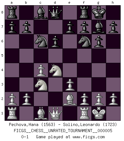 Last move : 0-1 2010 March 17 21:16:46 [Event "FICGS__CHESS__UNRATED_TOURNAMENT__000005"] [Site "FICGS"] [Date "2010.01.21"] [Round "1"] [White "Pechova,Hana"] [Black "Solino,Leonardo"] [Result "0-1"] [WhiteElo "1563"] [BlackElo "1723"] 1.c4 c5 2.Nc3 Nc6 3.Nf3 g6 4.d4 cxd4 5.Nxd4 Bg7 6.e3 Nf6 7.Be2 O-O 8.O-O d6 0-1 This chess game has been lost on time (started : 2010.01.21 0:17:47) English : Symmetrical variation Kingside Castling by player Black (move 7) Kingside Castling by player White (move 8) Player Black won this chess game. Follow this game move after move (download)I still hope to kill Fischer. (Boris Spassky) Schach ist gnadenlos. Du mußt bereit sein zu töten. (Nigel Short) Cuando tengo las piezas blancas, yo gano porque soy blanco; Cuando tengo las piezas negras, yo gano porque soy Bogolyubov. (Bogolyubov) Dans le domaine de la peinture, de la gravure et de la sculpture, dès la première décennie de notre siècle, les artistes abandonnent la représentation de la partie d'échecs pour se concentrer sur les pièces, sur les échiquiers et sur toutes les variations auxquelles les unes et les autres peuvent donner lieu. On passe en quelque sorte d'un thème social à un thème musical (au sens de la musica médiévale, c'est-à-dire d'une notion qui inclue le rythme, l'harmonie, la construction et la déconstruction, etc.). Graphiquement et picturalement, l'échiquier apparaît comme une structure ouverte, dynamique, d'une richesse infinie, autorisant toutes les combinatoires et débouchant sur des mouvements et des rythmes de nature exponentielle. (Michel Pastoureau) Imagination is more important than knowledge. Knowledge is limited. Imagination encircles the world. (Albert Einstein)