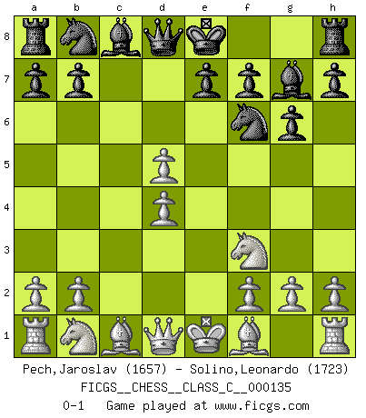 Last move : 0-1 2010 April 13 2:19:6 [Event "FICGS__CHESS__CLASS_C__000135"] [Site "FICGS"] [Date "2010.01.21"] [Round "1"] [White "Pech,Jaroslav"] [Black "Solino,Leonardo"] [Result "0-1"] [WhiteElo "1657"] [BlackElo "1723"] 1.e4 c5 2.c3 g6 3.Nf3 Bg7 4.d4 cxd4 5.cxd4 d5 6.exd5 Nf6 0-1 Sicilian : Alapin's variation (2.c3) Player Black won this chess game. Follow this game move after move (download)I have added these principles to the law: get the Knights into action before both Bishops are developed. (Emanuel Lasker) Ich verachte die Medien. (Robert James Fischer) ¿Esta Bobby Fischer algo cuerdo?. (Salo Flohr) Vous savez, camarade Pachman, je n'éprouve pas de plaisir à être ministre, je jouerais plutôt aux échecs comme vous, ou alors ferais une révolution au Venezuela. (Che Guevara à Ludek Pachman, 'Checkmate in Prague', 1975) The difference between perseverance and obstinacy is that one comes from a strong will, and the other from a strong won't. (Henry Ward Beecher)