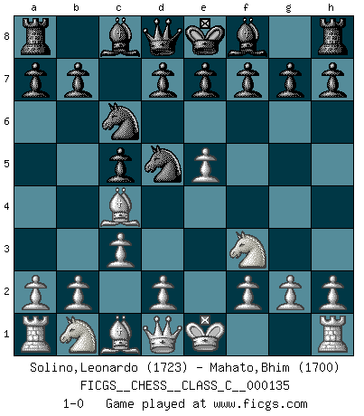 Last move : 1-0 2010 March 4 9:37:13 [Event "FICGS__CHESS__CLASS_C__000135"] [Site "FICGS"] [Date "2010.01.21"] [Round "1"] [White "Solino,Leonardo"] [Black "Mahato,Bhim"] [Result "1-0"] [WhiteElo "1723"] [BlackElo "1700"] 1.e4 c5 2.c3 Nf6 3.e5 Nd5 4.Nf3 Nc6 5.Bc4 1-0 This chess game has been lost on time (started : 2010.01.21 8:36:54) Sicilian : Alapin's variation (2.c3) Player White won this chess game. Follow this game move after move (download)I had a toothache during the first game. In the second game I had a headache. In the third game it was an attack of rheumatism. In the fourth game, I wasn't feeling well. And in the fifth game? Well, must one have to win every game ? (Siegbert Tarrasch) Über Kasparov: Es ist offensichtlich, daß er in einem totalitären Staat aufwuchs und deshalb zu diktatorischen Zügen neigt. (Viktor Kortschnoi) El Ajedrez no es como la vida... ¡tiene reglas!. (Mark Pasternak) Si le désir cupide (et stupide) de gagner est une inépuisable source de souffrance, une combinaison brillante sur l'échiquier est une découverte : le coquelicot qui s'épanouit lorsque apparaît la Voie Lactée. (Arrabal) There is no vagueness without wind. (Chinese proverb)