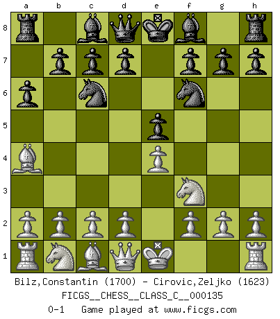 Last move : 0-1 2010 March 5 21:38:21 [Event "FICGS__CHESS__CLASS_C__000135"] [Site "FICGS"] [Date "2010.01.21"] [Round "1"] [White "Bilz,Constantin"] [Black "Cirovic,Zeljko"] [Result "0-1"] [WhiteElo "1700"] [BlackElo "1623"] 1.e4 e5 2.Nf3 Nc6 3.Bb5 a6 4.Ba4 Nf6 0-1 This chess game has been lost on time (started : 2010.01.21 8:36:54) Ruy Lopez : Morphy defense Player Black won this chess game. Follow this game move after move (download)You cannot play at Chess if you are kind-hearted. (French Proverb) Darum geht es im Schach. Einen Tag gibst du deinem Gegner eine Lektion, am nächsten Tag gibt er dir eine. (Robert James Fischer) Un Peón pasado es un criminal, quién debe ser mantenido bajo candado y llave. Leves medidas, tales como vigilancia policiaca, no son suficientes. (Aaron Nimzovich) Il s'avisa de me proposer d'apprendre les échecs qu'il jouait un peu... me voilà forcené des échecs. J'achète un échiquier, je m'enferme dans ma chambre, j'y passe des jours et des nuits à vouloir apprendre par cur toutes les parties. (Jean-Jacques Rousseau, Confessions) Coffee just isn't my cup of tea. (Unknown)