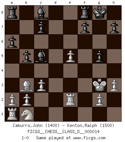 Last move : 1-0 2007 February 3 14:42:6 [Event "FICGS__CHESS__CLASS_D__000014"] [Site "FICGS"] [Date "2006.10.16"] [Round "1"] [White "Caburro,John"] [Black "Kenton,Ralph"] [Result "1-0"] [WhiteElo "1400"] [BlackElo "1500"] 1.e4 e5 2.Nf3 Nc6 3.Bb5 a6 4.Ba4 Nf6 5.O-O b5 6.Bb3 Be7 7.Re1 O-O 8.c3 d5 9.d4 dxe4 10.Nxe5 Nxe5 11.dxe5 Qxd1 12.Rxd1 Ng4 13.Bf4 Bc5 14.Rd2 e3 15.fxe3 Nxe3 16.Kh1 Ng4 17.h3 Nf2+ 18.Kh2 g5 19.Bg3 Ne4 20.Re2 Nxg3 21.Kxg3 1-0 Ruy Lopez : 5.O-O Kingside Castling by player White (move 5) Kingside Castling by player Black (move 7) Player White won this chess game. Follow this game move after move (download)Chess, like any creative activity, can exist only through the combined efforts of those who have creative talent, and those who have the ability to organize their creative work. (Mikhail Botvinnik) Ein Buch ist ein Spiegel; wenn ein Affe hineinsieht, so kann kein Apostel heraus gucken. (Georg Christoph Lichtenberg) La esencia del Ajedrez es pensar acerca de lo que el Ajedrez es. (David Bronstein) Karpov est une pièce de musée. (Garry Kasparov) How many people work in NATO Headquarters ? - About half of them. (Dirk Stikker, NATO general secretary)