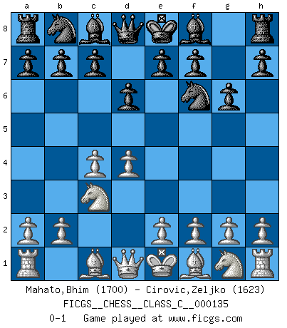 Last move : 0-1 2010 March 5 9:38:24 [Event "FICGS__CHESS__CLASS_C__000135"] [Site "FICGS"] [Date "2010.01.21"] [Round "1"] [White "Mahato,Bhim"] [Black "Cirovic,Zeljko"] [Result "0-1"] [WhiteElo "1700"] [BlackElo "1623"] 1.d4 Nf6 2.c4 d6 3.Nc3 g6 0-1 This chess game has been lost on time (started : 2010.01.21 8:36:54) Old Indian defense Player Black won this chess game. Follow this game move after move (download)Pawns are born free, yet they are everywhere in chains. (Rick Kennedy) Habe Mut, dich deines eigenen Verstandes zu bedienen. (Immanuel Kant) El Ajedrez era la lengua materna de Capablanca. (Reti) Les échecs, c'est l'imagination. (David Bronstein) Don't be irreplaceable, if you can't be replaced, you can't be promoted. (Dan Rotaru)