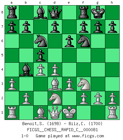 Last move : 1-0 2010 February 26 21:30:14 [Event "FICGS__CHESS__RAPID_C__000081"] [Site "FICGS"] [Date "2010.01.21"] [Round "1"] [White "Benoit,Sebastien"] [Black "Bilz,Constantin"] [Result "1-0"] [WhiteElo "1698"] [BlackElo "1700"] 1.d4 Nf6 2.c4 e6 3.Nf3 Bb4+ 4.Nbd2 O-O 5.e3 c5 6.Bd3 Nc6 7.a3 1-0 This chess game has been lost on time (started : 2010.01.21 8:38:59) Bogo-Indian defense, Gruenfeld variation Kingside Castling by player Black (move 4) Player White won this chess game. Follow this game move after move (download)A Chess game is a dialogue, a conversation between a player and his opponent. Each move by the opponent may contain threats or be a blunder, but a player cannot defend against threats or take advantage of blunders if he does not first ask himself: What is my opponent planning after each move ? (Bruce A. Moon) Aljechin war kein Nazi. Er war ein Opportunist. Ein schrecklicher Mann. Er liebte Geld über alles und würde für Geld ein Jude, ein Katolik oder ein Protestant werden. (Miguel Najdorf) No nos podemos resistir a la fascinación de un sacrificio ya que la pasión por los sacrificios es parte de la naturaleza de un jugador de Ajedrez. (Rudolf Spielman) Comme les marins qui ont mille raisons différentes d'aller en mer, les joueurs d'échecs en ont tout autant avant de s'installer devant une table et jouer... (Vincent Bertignac, philosophe) Wisdom begins at the end. (Daniel Webster)