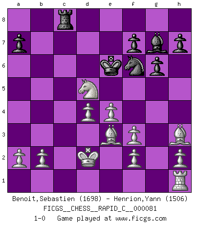 Last move : 1-0 2010 February 2 22:29:11 [Event "FICGS__CHESS__RAPID_C__000081"] [Site "FICGS"] [Date "2010.01.21"] [Round "1"] [White "Benoit,Sebastien"] [Black "Henrion,Yann"] [Result "1-0"] [WhiteElo "1698"] [BlackElo "1506"] 1.c4 g6 2.d4 Bg7 3.Nf3 d6 4.Nc3 e6 5.e4 Nc6 6.Be3 d5 7.cxd5 exd5 8.Nxd5 Bg4 9.Qb3 Bxf3 10.gxf3 Na5 11.Qa4+ Nc6 12.Rc1 Nf6 13.Rxc6 bxc6 14.Qxc6+ Nd7 15.Nxc7+ Kf8 16.Qxa8 Qxa8 17.Nxa8 Ke7 18.Nc7 Rc8 19.Nd5+ Ke6 20.Kd2 Nf6 21.Bh3+ 1-0 English Opening Player White won this chess game. Follow this game move after move (download)When you don't know what to do, wait for your opponent to get an idea - it's sure to be wrong. (Tarrasch) Smyslow ist ein Beweis dafür, dass ich noch zehn Jahre spielen kann! [der 75 jährige über den 85 jährigen] (Viktor Kortschnoi) Un Peón pasado es un criminal, quién debe ser mantenido bajo candado y llave. Leves medidas, tales como vigilancia policiaca, no son suficientes. (Aaron Nimzovich) Fischer est le meilleur joueur du monde et Karpov n'est qu'un joueur de bistrot. (Garry Kasparov, agé de 16 ans) Knowledge rests not upon truth alone, but upon error also. (Carl G. Jung)