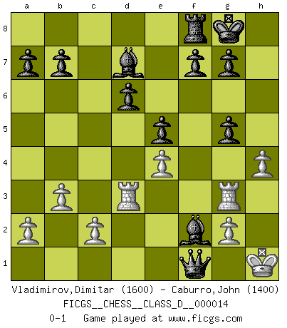 Last move : 0-1 2006 November 3 16:10:54 [Event "FICGS__CHESS__CLASS_D__000014"] [Site "FICGS"] [Date "2006.10.16"] [Round "1"] [White "Vladimirov,Dimitar"] [Black "Caburro,John"] [Result "0-1"] [WhiteElo "1600"] [BlackElo "1400"] 1.e4 c5 2.Nf3 d6 3.Bc4 Nf6 4.Nc3 Nc6 5.O-O e6 6.d4 cxd4 7.Nxd4 Be7 8.Qf3 Ne5 9.Qe2 Nxc4 10.Qxc4 Bd7 11.Re1 Rc8 12.Bg5 Rxc4 13.Rad1 O-O 14.Rd3 h6 15.b3 Rxc3 16.Rxc3 hxg5 17.R1e3 Ng4 18.Rg3 Bf6 19.Rxg4 Bxd4 20.Rd3 e5 21.R4g3 Qa5 22.h3 Qe1+ 23.Kh2 Bxf2 24.h4 Qg1+ 25.Kh1 Qf1+ 0-1 Sicilian Kingside Castling by player White (move 5) Kingside Castling by player Black (move 13) Player Black won this chess game. Follow this game move after move (download)The Pin is mightier than the sword. (Fred Reinfeld) Ich tröste mich mit dem Vergnügen, daß Schachfans, Zuschauer und Leser glücklich sind, wenn ein Großmeister etwas riskiert, statt nur Klötzchen zu schieben. (Mikhail Nekhemyevich Tal) La caracteristica mas importante en la posición del Ajedrez es la actividad de las piezas. Esto es absolutamente fundamental en todas las fases del juego: Apertura, Juego Medio y especialmente Finales. La limitación primordial en la actividad de una pieza, es la estructuración de los Peones. (Michael Stean) Le pion, dans sa simplicité, marche droit devant lui, mais lorsqu'il prend, il le fait obliquement? Ainsi l'homme, tant qu'il reste pauvre, marche dans la droiture et vit honnêtement, mais lorsqu'il recherche les honneurs, il flatte, se parjure et, par les voies obliques, cherche une position supérieure sur l'échiquier du monde. (Jean de Galles) When I took office, only high energy physicists had ever heard of what is called the World Wide Web... Now even my cat has its own page. (Bill Clinton, 1996)