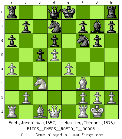 Last move : 0-1 2010 April 12 20:56:36 [Event "FICGS__CHESS__RAPID_C__000081"] [Site "FICGS"] [Date "2010.01.21"] [Round "1"] [White "Pech,Jaroslav"] [Black "Huntley,Theron"] [Result "0-1"] [WhiteElo "1657"] [BlackElo "1576"] 1.d4 Nf6 2.c4 e6 3.Nf3 c5 4.d5 d6 5.Nc3 exd5 6.cxd5 g6 7.e4 a6 8.a4 Bg4 9.Be2 Bxf3 10.Bxf3 Nbd7 11.O-O Bg7 0-1 This chess game has been lost on time (started : 2010.01.21 8:38:59) Queen's pawn game Kingside Castling by player White (move 11) Player Black won this chess game. Follow this game move after move (download)Fischer is completely natural. He plays no roles. He's like a child. Very, very simple. (Zita Rajcsanyi) Offener Brief an US-Präsident Bush anlässlich der Verhaftung Bobby Fishers: Verhaften Sie mich. Stecken Sie mich in dieselbe Zelle wie Bobby Fisher und geben Sie uns ein Schachspiel mit. (Boris Vassilievich Spassky) Una partida de Ajedrez se divide en 3 etapas: la primera cuando piensas que tienes la ventaja, la segunda cuando crees que tienes la ventaja y la tercera... ¡cuando te das cuenta que vas a perder!. (Savielly Tartakower) Karpov est une pièce de musée. (Garry Kasparov) You cannot beat a roulette table unless you steal money from it. (Albert Einstein)