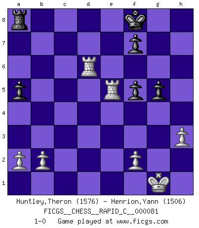 Last move : 1-0 2010 February 14 11:25:39 [Event "FICGS__CHESS__RAPID_C__000081"] [Site "FICGS"] [Date "2010.01.21"] [Round "1"] [White "Huntley,Theron"] [Black "Henrion,Yann"] [Result "1-0"] [WhiteElo "1576"] [BlackElo "1506"] 1.d4 Nf6 2.c4 d6 3.Nf3 g6 4.g3 Bg7 5.Bg2 e6 6.O-O O-O 7.Nc3 Nc6 8.e4 Re8 9.Be3 e5 10.d5 Ne7 11.Qd3 c6 12.dxc6 bxc6 13.Rad1 d5 14.cxd5 cxd5 15.Nxe5 Bg4 16.Nxg4 Nxg4 17.Bd4 Bxd4 18.Qxd4 dxe4 19.Qxe4 Qc8 20.h3 Nf6 21.Qxa8 Qxa8 22.Bxa8 Rxa8 23.Rfe1 Kf8 24.Rd6 Ne8 25.Rd7 Nf5 26.Ne4 a5 27.Ng5 Ned6 28.g4 h6 29.gxf5 hxg5 30.Rxd6 gxf5 31.Re5 1-0 Old Indian defense Kingside Castling by player White (move 6) Kingside Castling by player Black (move 6) Player White won this chess game. Follow this game move after move (download)Botvinnik tried to take the mystery out of Chess, always relating it to situations in ordinary life. He used to call Chess a typical inexact problem similar to those which people are always having to solve in everyday life. (Garry Kasparov) Über Karpov: Er war und ist ein Vertreter der russischen Reaktionäre. Das steckt tief in seiner Seele, wehalb ich nicht nett mit ihm umgehen kann. (Viktor Kortschnoi) Siempre es mucho mejor sacrificar las piezas de tu oponente. (Savielly Tartakover) Il n'y a pas de prix trop élevé au scalp de l'ennemi. (Koblentz) All art requires courage. (Anne Tucker)