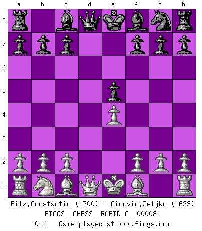 Last move : 0-1 2010 March 2 9:34:59 [Event "FICGS__CHESS__RAPID_C__000081"] [Site "FICGS"] [Date "2010.01.21"] [Round "1"] [White "Bilz,Constantin"] [Black "Cirovic,Zeljko"] [Result "0-1"] [WhiteElo "1700"] [BlackElo "1623"] 1.e4 d6 2.d4 Nd7 3.Nf3 e5 4.dxe5 Nxe5 5.Nxe5 dxe5 0-1 This chess game has been lost on time (started : 2010.01.21 8:38:59) King's pawn Opening Player Black won this chess game. Follow this game move after move (download)Becoming successful at Chess allows you to discover your own personality. That's what I want for the kids I teach. (Saudin Robovic) Matt entspricht nicht immer den Tatsachen. (Savielly Grigorievitsch Tartakower) Cada Peón es potencialmente una Reina. (James Mason) Botvinnik disait en comparant les échecs à la musique: Il existe une science dont le but est l'étude de l'acoustique et des sons. Mais il y a aussi un art qui se sert de l'océan des sons : c'est la musique. De toute évidence, il en est de même pour la pensée. La logique est l'étude des lois de la réflexion et les échecs reflètent, en tant qu'art, le côté logique de la réflexion, sous la forme d'images artistiques... Extrait de Fischer - Spassky, Reykjavik 1972 par Alexander & F. Wyndham (Ed. Solar), p 37. The beginning of wisdom is silence. The second step is listening. (Unknown)