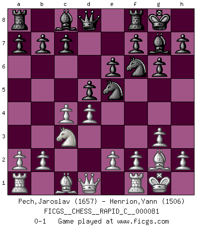Last move : 0-1 2010 April 12 8:56:44 [Event "FICGS__CHESS__RAPID_C__000081"] [Site "FICGS"] [Date "2010.01.21"] [Round "1"] [White "Pech,Jaroslav"] [Black "Henrion,Yann"] [Result "0-1"] [WhiteElo "1657"] [BlackElo "1506"] 1.c4 g6 2.Nc3 Bg7 3.g3 Nf6 4.Bg2 e6 5.Nf3 O-O 6.O-O Nc6 7.d4 d5 8.Ne5 Nxe5 0-1 This chess game has been lost on time (started : 2010.01.21 8:38:59) English Opening Kingside Castling by player Black (move 5) Kingside Castling by player White (move 6) Player Black won this chess game. Follow this game move after move (download)Chess is a more highly symbolic game, but the aggressions are therefore even more frankly represented in the play. It probably began as a war game; that is, the representation of a miniature battle between the forces of two kingdoms. (Karl Meninger) Ja, jede Frau in Holland liebt mich bestimmt, und alle Männer hassen mich. (Loek van Wely) Solo existe una cosa que Fischer hace en el Ajedrez sin placer: ¡perder!. (Boris Spassky) Je fais ceci parce que dans cinquante coups j'obtiendrai cela; je m'appelle Mikhail Moisevitch Botvinnik. (Botvinnik) For to win one hundred victories in one hundred battles is not the acme of skill. To subdue the enemy without fighting is the acme of skill. (Sun Tzu)