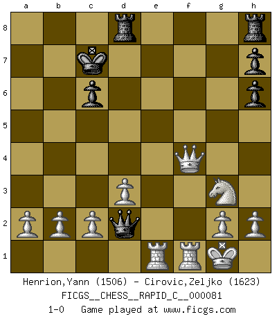 Last move : 1-0 2010 March 8 9:57:50 [Event "FICGS__CHESS__RAPID_C__000081"] [Site "FICGS"] [Date "2010.01.21"] [Round "1"] [White "Henrion,Yann"] [Black "Cirovic,Zeljko"] [Result "1-0"] [WhiteElo "1506"] [BlackElo "1623"] 1.e4 c5 2.Nf3 e6 3.Nc3 Nc6 4.Bb5 d5 5.O-O d4 6.Ne2 Bd7 7.Bxc6 Bxc6 8.d3 e5 9.Nxe5 Bd6 10.Nxc6 bxc6 11.f4 f6 12.Ng3 Nh6 13.e5 fxe5 14.fxe5 Bxe5 15.Bxh6 gxh6 16.Qe2 Qg5 17.Rae1 O-O-O 18.Qxe5 Qd2 19.Qxc5 Kc7 20.Qxa7+ Kd6 21.Qxd4+ Kc7 22.Qf4+ 1-0 Sicilian defense Kingside Castling by player White (move 5) Queenside Castling by player Black (move 17) Player White won this chess game. Follow this game move after move (download)Half the variations which are calculated in a tournament game turn out to be completely superfluous. Unfortunately, no one knows in advance which half. (Jan Tinman) Ein guter Spieler hat immer Glück. (José Raúl Capablanca) Cuando tu no sabes absolutamente que mas hacer, es tiempo de entrar en pánico. (John van der Wiel) Je crois qu'il existe des manières très spécifiques de jouer efficacement contre une machine. Evidemment, nous n'avons aucune chance en technique pure, parce que l'ordinateur calcule de manière parfaite. Mais lorsque nous faisons appel à notre cerveau, en utilisant l'intuition et la compréhension, alors nous restons beaucoup plus forts. (Anatoli Karpov) Do not put your faith in what statistics say until you have carefully considered what they do not say. (William W. Watt)