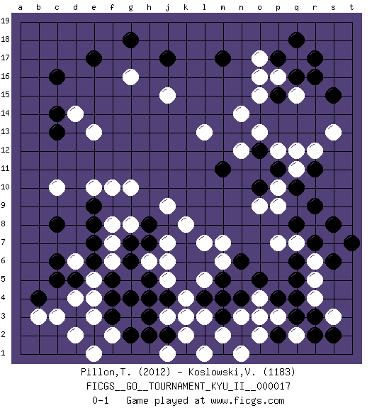 Last move : 0-1 2010 July 11 19:15:10 [Event "FICGS__GO__TOURNAMENT_KYU_II__000017"] [Site "FICGS"] [Date "2010.01.21"] [Round "1"] [Black "Pillon,Thibault"] [White "Koslowski,Volker"] [Result "0-1"] [Rating 1 "2012"] [Rating 2 "1183"] 1.q16 p3 2.c16 e4 3.j17 r4 4.c5 c3 5.c8 c10 6.e8 e10 7.c13 g10 8.h3 k3 9.h5 g8 10.l4 k4 11.k5 l5 12.m4 j5 13.k6 j6 14.j4 j3 15.h4 j7 16.l6 m6 17.m5 j1 18.h2 n14 19.q10 o9 20.q8 s13 21.s15 m2 22.l2 l3 23.m3 k2 24.n2 l1 25.j2 n3 26.n6 m7 27.o3 o2 28.n4 n1 29.p2 n3 30.f5 o4 31.o5 e5 32.e6 d6 33.d5 f6 34.e7 p7 35.q5 q7 36.r7 r6 37.p4 r8 38.q3 o3 39.q4 r5 40.r3 d4 41.c6 s3 42.s2 j15 43.g6 f7 44.e2 d2 45.f4 f2 46.g7 f8 47.h8 l7 48.h7 j9 49.k7 k8 50.f3 e3 51.g2 e1 52.g4 p16 53.p15 o15 54.p17 q11 55.r11 q2 56.r2 g16 57.m17 r12 58.p11 q12 59.o10 p12 60.o12 o13 61.r9 s7 62.m11 p9 63.s8 p10 64.r7 o16 65.s6 q17 66.r17 q15 67.r16 l5 68.t7 h6 69.q6 o17 70.q18 l13 71.e9 f10 72.e17 e13 73.b4 b3 74.g18 d14 75.c14 n12 0-1 Here are the names of the openings (joseki) played in the four corners : Corner d4 : e4 c5 Takamoku (Gomok, Gaomu`) 5-4 Point. The takamoku (high) point (5-4). With its emphasis on influence, the 5-4 point complements the 4-4 (hoshi) point in creating an influence-oriented fuseki. Corner q16 : q16 n14 Hoshi (Hwajeom, Seongjeom, Xingwei`) 4-4 Point. The star or hoshi (4-4) point, emphasizing influence at the potential expense of territory. Player White won this Go (weiqi, baduk) game. Follow this game move after move (download)Conservative and slow will win. Believe it ! (Anonymous) Programming can only do so much before it becomes too much. (Don Groves)