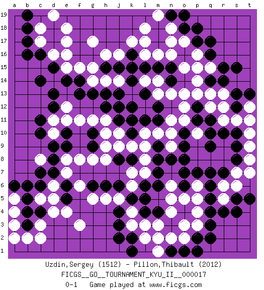 Last move : 0-1 2010 March 24 1:43:50 [Event "FICGS__GO__TOURNAMENT_KYU_II__000017"] [Site "FICGS"] [Date "2010.01.21"] [Round "1"] [Black "Uzdin,Sergey"] [White "Pillon,Thibault"] [Result "0-1"] [Rating 1 "1512"] [Rating 2 "2012"] 1.q16 d4 2.q3 d16 3.q9 o17 4.q14 l17 5.c14 g17 6.c16 c17 7.d17 e17 8.d18 c18 9.d15 e16 10.b16 n4 11.q5 k4 12.c6 c8 13.c10 e8 14.e6 f3 15.e10 f8 16.b4 c3 17.g6 h8 18.j6 d6 19.d7 d5 20.d8 e7 21.c7 f6 22.l6 n6 23.j8 j9 24.k8 k9 25.m8 l9 26.o8 l8 27.m7 l7 28.m6 k6 29.k5 k7 30.l4 j5 31.l5 k3 32.p17 l3 33.f14 r11 34.o16 n17 35.p11 q12 36.p12 q13 37.r14 p13 38.m15 n13 39.k15 j16 40.r10 n16 41.n15 o13 42.j15 p10 43.o10 o11 44.q11 o12 45.q10 n10 46.o9 p4 47.q4 p3 48.p2 o2 49.m11 m10 50.l11 n11 51.j11 g11 52.g10 h10 53.g9 h11 54.l13 s11 55.s13 r12 56.d12 t8 57.q7 s7 58.s5 o15 59.q2 p16 60.q17 g14 61.g13 h14 62.h13 j14 63.j13 f15 64.f13 f11 65.e9 g8 66.k14 h16 67.b18 e18 68.b17 d19 69.b3 b2 70.c4 c2 71.o18 n18 72.p18 r6 73.q6 r5 74.r4 s6 75.s4 e11 76.s10 t10 77.s8 d11 78.c11 d10 79.d9 c5 80.b5 e15 81.e14 p5 82.n19 m19 83.o19 l18 84.k16 k17 85.o1 n2 86.n1 m1 87.p1 m2 88.s9 t9 89.r7 t7 90.m9 l10 91.b19 e12 92.d13 t12 93.t13 j10 94.h12 k11 95.k12 j12 96.h15 g15 97.j11 n9 98.n8 p15 99.k10 q15 100.r15 k11 101.s12 t11 102.k10 r13 103.s15 k11 104.j12 l16 105.l15 n5 106.o6 a3 107.h6 a4 108.b6 p6 109.j4 h5 110.j3 g5 111.p7 o5 112.k2 l2 113.o7 m14 114.m4 m3 115.k10 l14 116.j2 o3 117.k11 p14 118.n14 m13 119.m12 a5 120.a6 a2 121.e5 e4 122.k1 m16 123.t5 h9 0-1 Here are the names of the openings (joseki) played in the four corners : Corner q16 : q16 o17 Hoshi (Hwajeom, Seongjeom, Xingwei`) 4-4 Point. The star or hoshi (4-4) point, emphasizing influence at the potential expense of territory. Ikken Kakari (Hankan Keolch'im, Yi Gua`jiao~, 1-Space Low Approach). White 2 is the standard approach move to the 4-4. Corner d16 : d16 c14 Hoshi (Hwajeom, Seongjeom, Xingwei`) 4-4 Point. The star or hoshi (4-4) point, emphasizing influence at the potential expense of territory. Ikken Kakari (Hankan Keolch'im, Yi Gua`jiao~, 1-Space Low Approach). Black 2 is the standard approach move to the 4-4. Corner d4 : d4 c6 Hoshi (Hwajeom, Seongjeom, Xingwei`) 4-4 Point. The star or hoshi (4-4) point, emphasizing influence at the potential expense of territory. Ikken Kakari (Hankan Keolch'im, Yi Gua`jiao~, 1-Space Low Approach). Black 2 is the standard approach move to the 4-4. Player White won this Go (weiqi, baduk) game. Follow this game move after move (download)The weak player fears ko, the strong player seeks it. (Bill Taylor) The problem with troubleshooting is that trouble shoots back. (Anonymous)