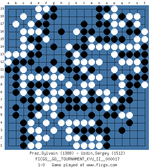 Last move : 1-0 2010 April 6 22:58:47 [Event "FICGS__GO__TOURNAMENT_KYU_II__000017"] [Site "FICGS"] [Date "2010.01.21"] [Round "1"] [Black "Praz,Sylvain"] [White "Uzdin,Sergey"] [Result "1-0"] [Rating 1 "1388"] [Rating 2 "1512"] 1.r16 d4 2.q3 p17 3.q15 n16 4.r10 d16 5.l17 r18 6.n18 d10 7.f17 f15 8.l15 n14 9.l13 o18 10.n17 c13 11.h16 q12 12.r13 r12 13.o16 n12 14.p10 p13 15.n15 n10 16.q7 p16 17.p15 n8 18.n6 l11 19.f3 j3 20.c3 d3 21.c4 c5 22.b5 c6 23.d2 e2 24.c2 e3 25.c17 c16 26.l3 f2 27.b6 d17 28.c7 r5 29.r4 q5 30.o3 e18 31.f18 c9 32.e6 g3 33.d5 o14 34.o15 p7 35.p6 o7 36.q6 o6 37.p5 s17 38.q18 q17 39.r17 s18 40.o19 p18 41.o5 m4 42.m3 l4 43.n4 k4 44.m5 k2 45.k3 j4 46.k6 l9 47.g14 j14 48.j13 r14 49.s13 q14 50.l2 s12 51.s16 s14 52.e13 g6 53.c12 f10 54.d12 d14 55.e14 g11 56.e15 b17 57.j11 k12 58.j12 k13 59.k14 e5 60.d6 g8 61.f5 f4 62.e4 g5 63.j8 j7 64.k7 m14 65.l14 t9 66.t10 q8 67.r8 q9 68.r9 q10 69.s9 k8 70.h7 g7 71.j6 j2 72.m11 m12 73.k11 l12 74.t12 j9 75.e11 s11 76.t11 e8 77.g12 e16 78.f16 p19 79.n19 l7 80.l6 e5 81.d15 c15 82.b12 b13 83.b10 f6 84.b9 f19 85.g19 e19 86.g18 c8 87.b8 t16 88.e17 c18 89.k10 t15 90.t13 e10 91.f11 h10 92.l10 m10 93.h11 g10 94.r7 a12 95.a11 a13 96.h9 h8 97.j7 l8 98.d8 m15 99.m16 l1 100.m1 k1 101.d9 c10 102.e9 n2 103.n3 m2 104.o2 e7 105.d7 n1 106.o1 m1 107.f8 f7 108.f9 g9 109.d13 c14 110.h5 h4 111.m7 c11 112.m8 m9 113.n7 o8 114.b11 p11 115.s10 d1 116.c1 e1 117.t14 s15 118.q13 p14 119.o17 k16 120.l16 1-0 Here are the names of the openings (joseki) played in the four corners : Corner q16 : r16 p17 Komoku (Somok, Xiao~mu`) 3-4 Point. The komoku (3-4) point is the traditional corner enclosure move.. Ikken Kakari (Hankan Keolch'im, Yi Gua`jiao~, 1-Space Low Pincer). The small knight move is the basic approach move to the 3-4 point stone. It has been continually used for over four centuries. There are limitless variations, with new moves constantly being discovered. White 2 opens the door to a treaure store of joseki. Corner d16 : d16 f17 Hoshi (Hwajeom, Seongjeom, Xingwei`) 4-4 Point. The star or hoshi (4-4) point, emphasizing influence at the potential expense of territory. Ikken Kakari (Hankan Keolch'im, Yi Gua`jiao~, 1-Space Low Approach). Black 2 is the standard approach move to the 4-4. Corner d4 : d4 f3 Hoshi (Hwajeom, Seongjeom, Xingwei`) 4-4 Point. The star or hoshi (4-4) point, emphasizing influence at the potential expense of territory. Ikken Kakari (Hankan Keolch'im, Yi Gua`jiao~, 1-Space Low Approach). Black 2 is the standard approach move to the 4-4. Player Black won this Go (weiqi, baduk) game. Follow this game move after move (download)There are players who don't accept exchange: they play many moves that perpetuate a previous state of the game. (Pierre Audouard) Waiting for chance ? Play in casinos. (FICGS proverb)