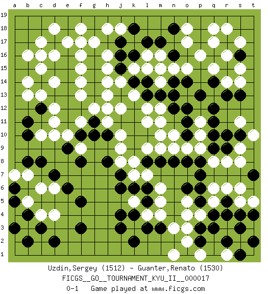 Last move : 0-1 2010 April 3 2:23:21 [Event "FICGS__GO__TOURNAMENT_KYU_II__000017"] [Site "FICGS"] [Date "2010.01.21"] [Round "1"] [Black "Uzdin,Sergey"] [White "Guanter,Renato"] [Result "0-1"] [Rating 1 "1512"] [Rating 2 "1530"] 1.q16 d4 2.q4 d16 3.f3 c6 4.d2 o17 5.c14 f16 6.c16 c17 7.d15 b16 8.e16 c15 9.d17 c16 10.e15 e17 11.f17 d18 12.g16 d14 13.m17 o15 14.q14 q18 15.r17 f15 16.e14 f14 17.e13 g17 18.j17 h16 19.g15 f18 20.g14 f13 21.d13 h15 22.m15 n13 23.n18 o18 24.q9 c13 25.c12 b13 26.c8 d12 27.e12 d11 28.b11 c10 29.b10 b14 30.f12 g12 31.f10 e10 32.e9 f11 33.g13 f17 34.g11 h12 35.e11 d10 36.c3 c4 37.e6 h11 38.h10 f9 39.m13 m12 40.n12 d14 41.f5 f11 42.d7 b7 43.b8 b3 44.b2 b5 45.a6 a7 46.a3 a4 47.b4 d6 48.a5 r18 49.n14 o13 50.o14 s17 51.s16 q17 52.p13 r16 53.o12 q15 54.r15 p16 55.g10 o3 56.p3 o4 57.l3 r6 58.r5 r8 59.r9 r14 60.r13 s14 61.s13 s15 62.f8 l4 63.k4 k3 64.m3 m4 65.j3 p4 66.q3 q5 67.s4 s5 68.r4 q6 69.p7 q8 70.p8 p9 71.n8 p10 72.q11 n10 73.l8 p11 74.q12 m9 75.m8 m11 76.k12 l9 77.j11 k8 78.k9 j8 79.h8 l16 80.k6 k5 81.j4 j9 82.k10 j10 83.j7 m16 84.n16 n15 85.l17 l15 86.k16 m14 87.l13 j12 88.k11 k15 89.k18 h18 90.j16 j18 91.j15 j14 92.j13 h13 93.k14 h14 94.l14 m15 95.l5 m5 96.l6 m6 97.o6 s9 98.s10 s8 99.p5 s11 100.q10 t10 101.r10 n3 102.k2 o5 103.p6 t5 104.t4 s6 105.t7 o2 106.p2 r1 107.r2 s2 108.s3 p1 109.s1 t1 110.t2 t3 111.o1 n1 112.t2 l7 113.s1 k7 114.o10 o9 115.o8 n9 116.o11 l12 117.l10 k13 118.j6 m10 119.j13 l11 120.n13 k13 0-1 Here are the names of the openings (joseki) played in the four corners : Corner d4 : d4 f3 Hoshi (Hwajeom, Seongjeom, Xingwei`) 4-4 Point. The star or hoshi (4-4) point, emphasizing influence at the potential expense of territory. Ikken Kakari (Hankan Keolch'im, Yi Gua`jiao~, 1-Space Low Approach). Black 2 is the standard approach move to the 4-4. Corner q16 : q16 o17 Hoshi (Hwajeom, Seongjeom, Xingwei`) 4-4 Point. The star or hoshi (4-4) point, emphasizing influence at the potential expense of territory. Ikken Kakari (Hankan Keolch'im, Yi Gua`jiao~, 1-Space Low Approach). White 2 is the standard approach move to the 4-4. Corner d16 : d16 c14 Hoshi (Hwajeom, Seongjeom, Xingwei`) 4-4 Point. The star or hoshi (4-4) point, emphasizing influence at the potential expense of territory. Ikken Kakari (Hankan Keolch'im, Yi Gua`jiao~, 1-Space Low Approach). Black 2 is the standard approach move to the 4-4. Player White won this Go (weiqi, baduk) game. Follow this game move after move (download)Five groups might live but the six will die. (Anonymous) Every man's memory is his private literature. (Aldous Huxley)