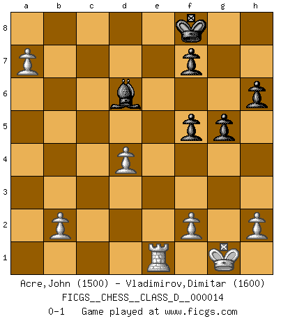 Last move : 0-1 2007 January 29 13:48:45 [Event "FICGS__CHESS__CLASS_D__000014"] [Site "FICGS"] [Date "2006.10.16"] [Round "1"] [White "Acre,John"] [Black "Vladimirov,Dimitar"] [Result "0-1"] [WhiteElo "1500"] [BlackElo "1600"] 1.d4 d5 2.Bg5 Nf6 3.Bxf6 exf6 4.e3 Bd6 5.g3 O-O 6.Bg2 c6 7.Ne2 Bf5 8.O-O Nd7 9.Nd2 Bg6 10.c4 dxc4 11.Nxc4 Bc7 12.Qb3 a5 13.Qxb7 Bd3 14.Qxc6 Bxe2 15.Rfe1 Bxc4 16.Qxa8 Nb6 17.Qxa5 Bd5 18.Bxd5 Nxd5 19.Qa4 Qd6 20.Rac1 Rb8 21.Qc6 Qxc6 22.Rxc6 h6 23.Rc5 Rd8 24.e4 Bxg3 25.Rxd5 Rxd5 26.exd5 Bd6 27.a4 Kf8 28.a5 Bb8 29.a6 f5 30.d6 Bxd6 31.a7 g5 0-1 Levitsky attack (Queen's Bishop attack) Kingside Castling by player Black (move 5) Kingside Castling by player White (move 8) Player Black won this chess game. Follow this game move after move (download)I play correspondence chess because it is both art and science while chess is art only. (A player at FICGS) Die starken Figuren des Gegners muss man abtauschen. (José Raúl Capablanca) ¿Esta Bobby Fischer algo cuerdo?. (Salo Flohr) Botvinnik disait en comparant les échecs à la musique: Il existe une science dont le but est l'étude de l'acoustique et des sons. Mais il y a aussi un art qui se sert de l'océan des sons : c'est la musique. De toute évidence, il en est de même pour la pensée. La logique est l'étude des lois de la réflexion et les échecs reflètent, en tant qu'art, le côté logique de la réflexion, sous la forme d'images artistiques... Extrait de Fischer - Spassky, Reykjavik 1972 par Alexander & F. Wyndham (Ed. Solar), p 37. Some people are so afraid to die that they never begin to live. (Henry Van Dyke)