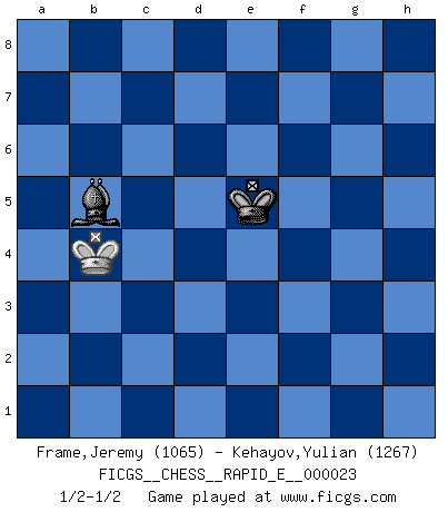 Last move : 1/2-1/2 2010 February 24 22:39:27 [Event "FICGS__CHESS__RAPID_E__000023"] [Site "FICGS"] [Date "2010.01.24"] [Round "1"] [White "Frame,Jeremy"] [Black "Kehayov,Yulian"] [Result "1/2-1/2"] [WhiteElo "1065"] [BlackElo "1267"] 1.e4 e5 2.Nf3 d6 3.d4 exd4 4.Nxd4 Qd7 5.Nc3 Nf6 6.f4 Nc6 7.Bb5 Be7 8.Nxc6 bxc6 9.Bd3 O-O 10.Be3 d5 11.exd5 cxd5 12.O-O d4 13.Bxd4 Qxd4+ 14.Kh1 Bd6 15.Bxh7+ Nxh7 16.Qxd4 Be6 17.Ne4 Rad8 18.Nxd6 Rxd6 19.Qxa7 Rd2 20.f5 Bd5 21.Qa5 Bxg2+ 22.Kg1 Bxf1 23.Qxd2 Bh3 24.Kf2 Bxf5 25.Rg1 c6 26.h4 Bh3 27.h5 Bf5 28.Qh6 g6 29.hxg6 fxg6 30.Rxg6+ Bxg6 31.Ke3 Bxc2 32.Qxc6 Bb1 33.a4 Nf6 34.a5 Kg7 35.a6 Kg8 36.a7 Kg7 37.Qb7+ Kg8 38.Qb8 Be4 39.Qxf8+ Kxf8 40.Kd4 Ke7 41.Kc5 Kd7 42.Kb6 Ba8 43.b4 Kc8 44.b5 Bb7 45.Ka5 Nd5 46.b6 Kd7 47.a8Q Bxa8 48.Ka6 Kc6 49.b7 Bxb7+ 50.Ka5 Kc5 51.Ka4 Kc4 52.Ka3 Bc6 53.Kb2 Ne3 54.Kc1 Kc3 55.Kb1 Ba4 56.Ka2 Nc4 57.Kb1 Bb3 58.Kc1 Ne3 59.Kb1 Bc4 60.Kc1 Nc2 61.Kd1 Ne3+ 62.Kc1 Kb3 63.Kd2 Nf5 64.Kd1 Kb2 65.Kd2 Bb5 66.Ke1 Kc2 67.Kf2 Kd3 68.Kf3 Bd7 69.Kf4 Kd4 70.Kg5 Ke5 71.Kg6 Ke6 72.Kg5 Ne7 73.Kf4 Kf6 74.Ke4 Bc6+ 75.Kd4 Ke6 76.Kc5 Ke5 77.Kc4 Kd6 78.Kd4 Nd5 79.Ke4 Ne7 80.Kd4 Nd5 81.Kc4 Ke5 82.Kc5 Bd7 83.Kc4 Nb4 84.Kxb4 Bb5 1/2-1/2 Philidor : Exchange variation Kingside Castling by player Black (move 9) Kingside Castling by player White (move 12) 10 pieces endgame at move 30 : White KQPPP , Black KRBNP WHITE : King + 1 Queen 3 Pawns BLACK : King + 1 Rook 1 Bishop 1 Knight 1 Pawn 9 pieces endgame at move 31 : White KQPP , Black KRBNP WHITE : King + 1 Queen 2 Pawns BLACK : King + 1 Rook 1 Bishop 1 Knight 1 Pawn 8 pieces endgame at move 32 : White KQPP , Black KRBN WHITE : King + 1 Queen 2 Pawns BLACK : King + 1 Rook 1 Bishop 1 Knight 7 pieces endgame at move 39 : White KQPP , Black KBN WHITE : King + 1 Queen 2 Pawns BLACK : King + 1 Bishop 1 Knight 6 pieces endgame at move 39 : White KPP , Black KBN WHITE : King + 2 Pawns BLACK : King + 1 Bishop 1 Knight Promotion Queen by player White (move 47) 5 pieces endgame at move 47 : White KP , Black KBN WHITE : King + 1 Pawn BLACK : King + 1 Bishop 1 Knight 4 pieces endgame at move 49 : White K , Black KBN WHITE : King + BLACK : King + 1 Bishop 1 Knight 3 pieces endgame at move 84 : White K , Black KB WHITE : King + BLACK : King + 1 Bishop This chess game ended in a draw. Follow this game move after move (download)Avoid the crowd. Do your own thinking independently. Be the Chess player, not the Chess piece. (Ralph Charell) Die meiste Zeit treffe ich auf Gegner, die meine Enkel sein könnten. Ich bin da, um ihnen zu zeigen, dass sie von mir noch einiges lernen können. (Viktor Kortschnoi) Vive, pierde y aprende al observar a tu oponente como ganar. (Amber Steenbock) Aux échecs, les retours au sommet sont rares : les dommages psychologiques consécutifs à une défaite sont trop sévères. (Daily Telegraph) Don't be irreplaceable, if you can't be replaced, you can't be promoted. (Dan Rotaru)