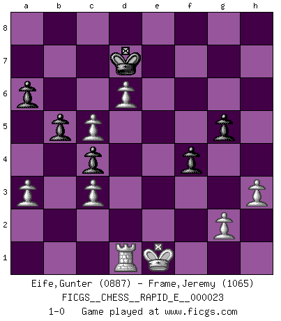 Last move : 1-0 2010 February 24 0:6:53 [Event "FICGS__CHESS__RAPID_E__000023"] [Site "FICGS"] [Date "2010.01.24"] [Round "1"] [White "Eife,Gunter"] [Black "Frame,Jeremy"] [Result "1-0"] [WhiteElo "0887"] [BlackElo "1065"] 1.e4 e5 2.Nf3 Nf6 3.Nxe5 d6 4.Nf3 Nxe4 5.Qe2 Qe7 6.d3 Nf6 7.Qxe7+ Bxe7 8.Be2 c6 9.h3 Be6 10.Be3 Nbd7 11.Nc3 O-O 12.O-O d5 13.d4 Rfe8 14.Rad1 h6 15.a3 a6 16.Bd3 b6 17.Rfe1 c5 18.Na4 c4 19.Be2 b5 20.Nc3 Ne4 21.Nxe4 dxe4 22.Nd2 f5 23.c3 g5 24.Nf1 Rad8 25.Nh2 Nf6 26.f3 Nd5 27.Nf1 Nxe3 28.Nxe3 exf3 29.Bxf3 f4 30.Ng4 Bd5 31.Nxh6+ Kh7 32.Bxd5 Kxh6 33.Bf7 Kg7 34.Bxe8 Rxe8 35.d5 Bc5+ 36.Kf1 Rxe1+ 37.Kxe1 Kf8 38.d6 Ke8 39.b4 Kd7 40.bxc5 1-0 Petrov : Cozio (Lasker) attack Kingside Castling by player Black (move 11) Kingside Castling by player White (move 12) Player White won this chess game. Follow this game move after move (download)Chess books should be used as we use glasses: to assist the sight, although some players make use of them as if they thought they conferred sight. (Jose Raul Capablanca) Schach ist wie eine schöne Frau, zu der wir ständig zurückkehren, gleichviel, wie oft sie uns zurückweist. (Anonymous) Es muy difícil jugar en contra de la teoría de Einstein. - en su primera derrota en contra de Fischer (Mikhail Tal) Les Echecs sont et restent toujours un combat, un combat intégral comme la boxe, la lutte ou un autre sport, et où il doit y avoir un vainqueur et un vaincu. (Joseph Emil Diemer) The best teachers teach from the heart, not from the book. (Author unknown)