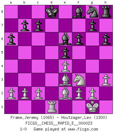 Last move : 1-0 2010 March 16 9:17:0 [Event "FICGS__CHESS__RAPID_E__000023"] [Site "FICGS"] [Date "2010.01.24"] [Round "1"] [White "Frame,Jeremy"] [Black "Houtzager,Lex"] [Result "1-0"] [WhiteElo "1065"] [BlackElo "1300"] 1.e4 e5 2.Nf3 Nc6 3.d4 d6 4.dxe5 Bg4 5.Bc4 Nxe5 6.Be2 h6 7.Be3 a6 8.Nbd2 Qd7 9.h3 Be6 10.Nxe5 dxe5 11.Nf3 f6 12.Qxd7+ Kxd7 13.O-O Rd8 14.Rfd1+ Kc8 15.Rxd8+ Kxd8 16.Rd1+ 1-0 This chess game has been lost on time (started : 2010.01.24 4:1:13) Scotch Opening Kingside Castling by player White (move 13) Player White won this chess game. Follow this game move after move (download)Place the contents of the Chess box in a hat, shake them up vigorously, pour them on the board from a height of two feet, and you get the style of Steinitz. (H. E. Bird) Nicht daß Diemer aus Opportunismus Mitglied der NSDAP geworden wäre. Er war ein Fanatiker, in allem, was er tat. (Hans Ree) Los Peones son nacidos libres, y aún así, se encuentran por doquier encadenados. (Rick Kennedy) Les échecs, c'est la lutte contre l'erreur. (Johannes Zukertort) I don't believe in psychology. I believe in good moves. (Bobby Fischer)