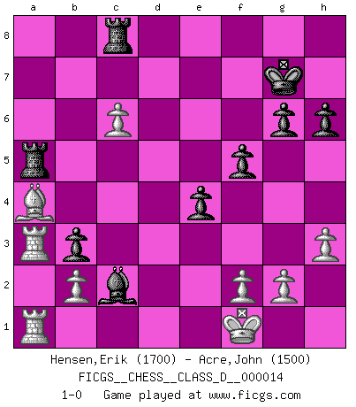 Last move : 1-0 2007 January 26 19:16:45 [Event "FICGS__CHESS__CLASS_D__000014"] [Site "FICGS"] [Date "2006.10.16"] [Round "1"] [White "Hensen,Erik"] [Black "Acre,John"] [Result "1-0"] [WhiteElo "1700"] [BlackElo "1500"] 1.e4 e5 2.Nf3 Nc6 3.Bc4 Nf6 4.d3 h6 5.O-O d6 6.c3 g6 7.d4 Qe7 8.Re1 Bg7 9.Nbd2 O-O 10.h3 Bd7 11.Nf1 Na5 12.Bd3 c5 13.Bd2 b5 14.Qe2 Rab8 15.Ng3 Rfc8 16.Rac1 c4 17.Bc2 Nc6 18.Be3 a5 19.Qd2 Kh7 20.Rb1 exd4 21.Nxd4 b4 22.Nxc6 Rxc6 23.Bd4 b3 24.axb3 cxb3 25.Bd3 a4 26.Ra1 Ra8 27.c4 R6c8 28.Qc3 Bc6 29.Ra3 Kg8 30.Ne2 Bxe4 31.Ng3 d5 32.c5 Qd8 33.Bb5 Qa5 34.Qxa5 Rxa5 35.Bxa4 Bc2 36.Rea1 Ne4 37.Bxg7 Kxg7 38.Nxe4 dxe4 39.c6 f5 40.Kf1 1-0 Two knights defense (Modern Bishop's Opening) Kingside Castling by player White (move 5) Kingside Castling by player Black (move 9) Player White won this chess game. Follow this game move after move (download)Fischer is the strongest player in the world. In fact, the strongest player who ever lived. (Larry Evans) Wenn sie aufgeben, dann danke ich Ihnen für das Spiel (Eventualzug beim Fernschach). (Anonymous) Siempre es mucho mejor sacrificar las piezas de tu oponente. (Savielly Tartakover) Je fais ceci parce que dans cinquante coups j'obtiendrai cela; je m'appelle Mikhail Moisevitch Botvinnik. (Botvinnik) All men can see these tactics whereby I conquer, but what none can see is the strategy out of which victory is evolved. (Sun Tzu)