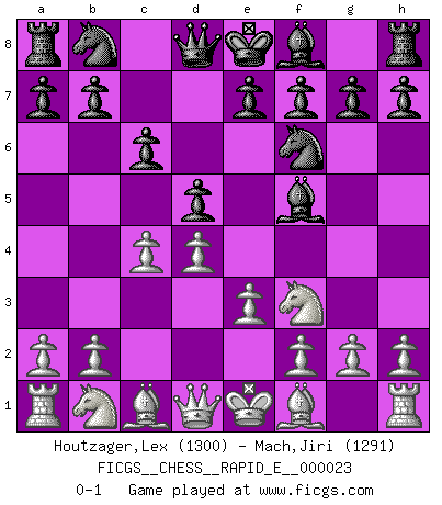 Last move : 0-1 2010 March 27 21:39:56 [Event "FICGS__CHESS__RAPID_E__000023"] [Site "FICGS"] [Date "2010.01.24"] [Round "1"] [White "Houtzager,Lex"] [Black "Mach,Jiri"] [Result "0-1"] [WhiteElo "1300"] [BlackElo "1291"] 1.d4 d5 2.c4 c6 3.Nf3 Nf6 4.e3 Bf5 0-1 This chess game has been lost on time (started : 2010.01.24 4:1:13) QGD Slav : 4.e3 Bf5 Player Black won this chess game. Follow this game move after move (download)I won't play with you anymore. You have insulted my friend. - When an opponent cursed himself for a blunder. (Miguel Najdorf) Ja, ich habe einmal eine Blitzpartie gespielt, es war in einem Zug, 1929. --im Interview 1989 (Mikhail Moiseyevich Botvinik) El tablero es el mundo, las piezas es el fenomeno del universo, las reglas del juego son lo que llamamos leyes de la naturaleza y el jugador del lado opuesto, se encuentra oculto a nuestra vista. (Thomas Huxley) Echiquier : carré parfait, comme la Jérusalem nouvelle décrite par l'auteur de l'Apocalypse, huit cases sur huit, exaltation du chiffre 4, symbole du cosmos aux quatre horizons... où le noir et le blanc, l'ombre et la lumière, le mal et le bien s'entremêlent et se conjuguent. (Robert Couffignal, Le Gambit du poète) Warrior pose battles inner weakness and wins focus. You see that there is no war within you. You're on your own side, and you are your own strength. (Terri Guillemets)