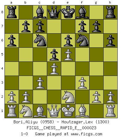 Last move : 1-0 2010 March 29 10:41:13 [Event "FICGS__CHESS__RAPID_E__000023"] [Site "FICGS"] [Date "2010.01.24"] [Round "1"] [White "Bori,Aliyu"] [Black "Houtzager,Lex"] [Result "1-0"] [WhiteElo "0958"] [BlackElo "1300"] 1.e3 Nc6 2.d4 d5 3.f3 Nf6 4.e4 a6 5.Ne2 h6 6.e5 e6 7.c3 1-0 This chess game has been lost on time (started : 2010.01.24 4:1:13) Van't Kruijs Opening Player White won this chess game. Follow this game move after move (download)Without error there can be no brilliancy. (Emanuel Lasker) Es gibt nur zwei wahre Schachgenies - das andere war Wilhelm Steinitz, der Weltmeister von 1872 bis 1894. (Robert James Fischer) Solo los afeminados hacen el Enroque. (Rob Sillars) C'est une question de caractère, Beaucoup de gens perdent leur motivation très vite. D'autres, ils sont rares, peuvent la conserver très longtemps. J'aime les échecs, encore aujourd'hui je suis heureux d'analyser des parties. J'aime toujours gagner, je déteste encore perdre. Bien jouer est important pour mon intégrité intellectuelle et morale. Et puis les échecs vivent en ce moment une période historique grâce à Internet. Ils se développent dans les systèmes éducatifs à travers le monde. Ils sortent de leur ghetto, et c'est mon rôle de mener à bien cette révolution. (Gary Kasparov) How many people work in NATO Headquarters ? - About half of them. (Dirk Stikker, NATO general secretary)