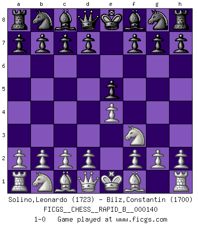 Last move : 1-0 2010 February 26 21:30:14 [Event "FICGS__CHESS__RAPID_B__000140"] [Site "FICGS"] [Date "2010.01.24"] [Round "1"] [White "Solino,Leonardo"] [Black "Bilz,Constantin"] [Result "1-0"] [WhiteElo "1723"] [BlackElo "1700"] 1.e4 e5 2.Nf3 1-0 This chess game has been lost on time (started : 2010.01.24 17:39:56) King's knight Opening Player White won this chess game. Follow this game move after move (download)Botvinnik tried to take the mystery out of Chess, always relating it to situations in ordinary life. He used to call Chess a typical inexact problem similar to those which people are always having to solve in everyday life. (Garry Kasparov) Ich könnte leicht behaupten: Ja,ja, Leonid Breschnew wollte nicht, daß ich Weltmeister werde. In der Tat war die Sache komplizierter. (Viktor Kortschnoi) La única cosa que los jugadores de Ajedrez tienen en común, es el Ajedrez. (Lodewijk Prins) Avant la finale, les dieux ont créé le milieu de partie. (Tarrasch) I feel so... helpless. (C-3PO in Star Wars ep.3)