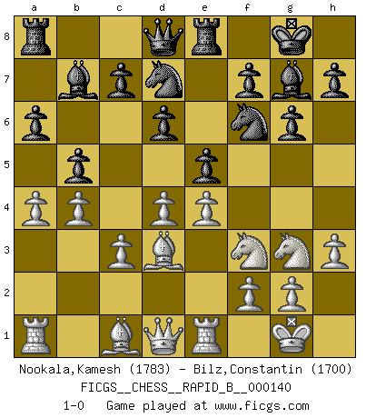 Last move : 1-0 2010 March 12 21:52:48 [Event "FICGS__CHESS__RAPID_B__000140"] [Site "FICGS"] [Date "2010.01.24"] [Round "1"] [White "Nookala,Kamesh"] [Black "Bilz,Constantin"] [Result "1-0"] [WhiteElo "1783"] [BlackElo "1700"] 1.e4 e5 2.Nf3 Nc6 3.Bb5 a6 4.Ba4 Nf6 5.O-O Be7 6.Re1 b5 7.Bb3 d6 8.c3 O-O 9.h3 Nb8 10.d3 Bb7 11.Nbd2 Nbd7 12.Nf1 Nc5 13.Bc2 Re8 14.Ng3 Bf8 15.b4 Ncd7 16.d4 g6 17.a4 Bg7 18.Bd3 1-0 This chess game has been lost on time (started : 2010.01.24 17:39:56) Ruy Lopez : Closed Kingside Castling by player White (move 5) Kingside Castling by player Black (move 8) Player White won this chess game. Follow this game move after move (download)Many have become Chess Masters, no one has become the Master of Chess. (Siegbert Tarrasch) Ein Remis kann durch Wiederholung von drei Zügen oder durch einen schlechte Zug erreicht werden. (Savielly Grigorievitsch Tartakower) El estómago es una parte esencial del maestro de Ajedrez. (Bent Larsen) Les échecs c'est le défi de l'alpiniste, toujours plus haut, prêt à tout pour monter à l'assaut du Roi ennemi. Les échecs, c'est de la musique en mouvement, un ballet majestueux pour les yeux. C'est de la poésie composée par les fantômes du passé qui au même titre que Rimbaud ou Verlaine méritent notre admiration. Les échecs, c'est de la peinture ou le moindre mouvement modifie le tableau pour en faire un Picasso ou un Van Gogh. Les échecs, c'est tout et rien, c'est la vie et la mort. Jjulie33 sur le forum de France-Echecs. Computers are like Old Testament gods; lots of rules and no mercy. (Joseph Campbell)