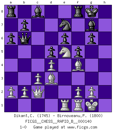 Last move : 1-0 2010 April 7 8:45:56 [Event "FICGS__CHESS__RAPID_B__000140"] [Site "FICGS"] [Date "2010.01.24"] [Round "1"] [White "Dikant,Christophe"] [Black "Birnoveanu,Petru"] [Result "1-0"] [WhiteElo "1745"] [BlackElo "1800"] 1.d4 d5 2.Nf3 e6 3.e3 c5 4.c3 Nc6 5.Bd3 cxd4 6.exd4 g6 7.O-O Bg7 8.Qe2 Nge7 9.Bf4 O-O 10.Nbd2 a6 11.h4 f6 12.Rae1 Qb6 13.Nb3 Nd8 14.Qc2 Qc6 15.h5 f5 16.hxg6 hxg6 17.Ne5 Qb6 18.Nd2 Ndc6 19.Ndf3 Nxe5 20.Nxe5 1-0 This chess game has been lost on time (started : 2010.01.24 17:39:56) Queen's pawn game Kingside Castling by player White (move 7) Kingside Castling by player Black (move 9) Player White won this chess game. Follow this game move after move (download)The sign of a great Master is his ability to win a won game quickly and painlessly. (Irving Chernev) Drei Punkte vor allen anderen ist wie einer, der im weißen Anzug posiert, während der Rest in Müllsäcke gekleidet dasteht. (Viktor Kortschnoi) No es suficiente ser un buen jugador, se debe también de jugar bién. (Siegbert Tarrasch) Les échecs sont un jeu par leur forme, un art par leur essence et une science par sa difficulté d'acquisition. Ils peuvent vous procurer autant de plaisir qu'un bon livre ou une belle musique, mais vous n'aurez une réelle joie que si vous arrivez à bien jouer. (Tigran Petrosian) A woman without a man is like a fish without a bicycle. (Gloria Steinem)