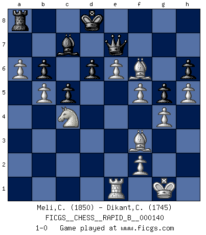 Last move : 1-0 2010 March 24 18:12:44 [Event "FICGS__CHESS__RAPID_B__000140"] [Site "FICGS"] [Date "2010.01.24"] [Round "1"] [White "Meli,Cosimo Leonardo"] [Black "Dikant,Christophe"] [Result "1-0"] [WhiteElo "1850"] [BlackElo "1745"] 1.d4 c5 2.d5 e5 3.e4 d6 4.Nc3 Be7 5.Nf3 Bg4 6.h3 Bxf3 7.Qxf3 a6 8.Qg3 g6 9.h4 h6 10.Be2 Nd7 11.h5 g5 12.a4 Ngf6 13.a5 Qc7 14.Bd2 O-O-O 15.Ra4 Rdf8 16.Nd1 Ne8 17.Ne3 Ng7 18.Qf3 f5 19.exf5 Nf6 20.g4 Qd7 21.b3 Nge8 22.O-O Nc7 23.c4 Bd8 24.Ra2 Rh7 25.b4 Nce8 26.Rb1 e4 27.Qg2 Qe7 28.Bc3 R8f7 29.Rab2 Qf8 30.Bd1 Rc7 31.b5 axb5 32.cxb5 b6 33.Nc4 Rb7 34.a6 Ra7 35.Rd2 Rhe7 36.Bc2 Bc7 37.Re1 Kd7 38.Bxe4 Qf7 39.Rde2 Ng7 40.Qf1 Kd8 41.Bf3 Rxe2 42.Qxe2 Ra8 43.Qe6 Nxe6 44.dxe6 Qe7 45.Bxf6 1-0 Semi-Benoni (`blockade variation') Queenside Castling by player Black (move 14) Kingside Castling by player White (move 22) Player White won this chess game. Follow this game move after move (download)Life is a kind of Chess, with struggle, competition, good and ill events. (Benjamin Franklin) Je älter ich werde, um so mehr schätze ich die Bauern. (Paul Keres) Un buen jugador siempre tiene buena suerte. (José Raúl Capablanca) Les Echecs, c'est l'art de la guerre sans les charniers, c'est la résurrection des morts tombés au champ d'honneur, l'espoir perpétuel, la suprématie de l'intelligence sur la force, la culture de l'esprit. (F. Szpiner) The human is the only animal species whose members are able to talk themselves into difficulties that would not otherwise exist. (Wendell Johnson)