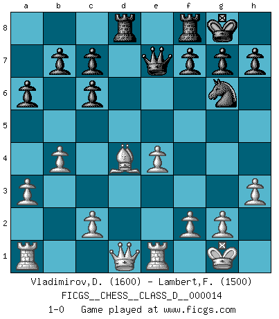 Last move : 1-0 2007 January 26 7:13:12 [Event "FICGS__CHESS__CLASS_D__000014"] [Site "FICGS"] [Date "2006.10.16"] [Round "1"] [White "Vladimirov,Dimitar"] [Black "Lambert,Frederic"] [Result "1-0"] [WhiteElo "1600"] [BlackElo "1500"] 1.e4 Nc6 2.Bb5 e5 3.Nf3 a6 4.Bxc6 dxc6 5.O-O Bg4 6.d3 Bc5 7.Nbd2 Ne7 8.h3 Bxf3 9.Nxf3 Ng6 10.a3 Qe7 11.b4 Bb6 12.Bb2 O-O 13.Re1 Rad8 14.d4 exd4 15.Nxd4 Bxd4 16.Bxd4 1-0 This chess game has been lost on time (started : 2006.10.16 14:37:47) KP : Nimzovich defense Kingside Castling by player White (move 5) Kingside Castling by player Black (move 12) Player White won this chess game. Follow this game move after move (download)Man is a frivolous, a specious creature, and like a Chess player, cares more for the process of attaining his goal than for the goal itself. (Dostoyevsky) Fischer ist das größte Genie, das je vom Schachhimmel heruntergestiegen ist. (Mikhail Nekhemyevich Tal) El Ajedrez es una manera fabulosa para que los niños aprendan a autovalorarse y a autoestimarse. (Saudin Robovic) On a dit que l'homme se distingue de l'animal par le fait qu'il achète plus de livres qu'il ne peut en lire. Je voudrais suggérer qu'inclure à la liste des livres quelques livres d'échecs rendrait la distinction manifeste. (Edward Lasker) A clear conscience is usually the sign of a bad memory. (Unknown)