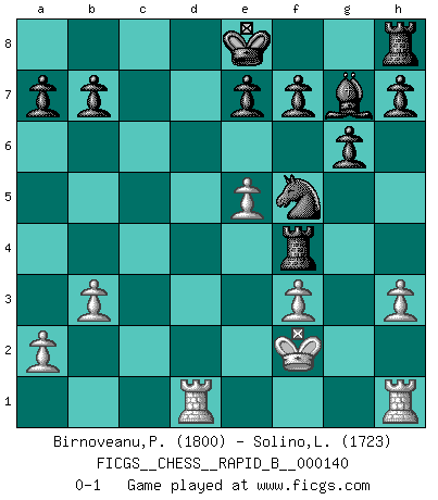 Last move : 0-1 2010 March 16 11:41:52 [Event "FICGS__CHESS__RAPID_B__000140"] [Site "FICGS"] [Date "2010.01.24"] [Round "1"] [White "Birnoveanu,Petru"] [Black "Solino,Leonardo"] [Result "0-1"] [WhiteElo "1800"] [BlackElo "1723"] 1.e4 c5 2.f4 g6 3.Nf3 Bg7 4.c3 Nc6 5.Be2 d5 6.e5 Bg4 7.d4 cxd4 8.cxd4 Nh6 9.b3 Nf5 10.Bb5 Qa5+ 11.Bd2 Qxb5 12.Nc3 Qd3 13.Nxd5 Qe4+ 14.Kf2 Qxd5 15.Bc3 Rd8 16.h3 Bxf3 17.Qxf3 Qxf3+ 18.gxf3 Ncxd4 19.Bxd4 Rxd4 20.Rad1 Rxf4 0-1 Sicilian : Grand Prix attack Player Black won this chess game. Follow this game move after move (download)You are for me the Queen on d8 and I am the Pawn on d7 !! (Eduard Gufeld) Kombinieren und Schwarzhandel gehören verboten. (Savielly Grigorievitsch Tartakower) Una compensación adecuada por un sacrificio es tener una combinación sólida que conduce a una posición ganadora; una compensación adecuada por una metida de pata es dejar a tu oponente arrebatar una derrota de las fauces de la victoria. (Bruce A. Moon) Un millionnaire : 'Monsieur Steinitz ! Vous ne participez aux tournois que pour l'argent, alors que moi je n'y viens que pour l'honneur.' Steinitz : 'Chacun joue pour ce qu'il n'a pas'... Convictions are more dangerous enemies of truth than lies. (Friedrich Nietzsche)