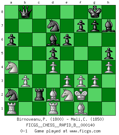 Last move : 0-1 2010 March 30 10:40:36 [Event "FICGS__CHESS__RAPID_B__000140"] [Site "FICGS"] [Date "2010.01.24"] [Round "1"] [White "Birnoveanu,Petru"] [Black "Meli,Cosimo Leonardo"] [Result "0-1"] [WhiteElo "1800"] [BlackElo "1850"] 1.d4 d5 2.c4 c6 3.Nc3 Nf6 4.cxd5 cxd5 5.g3 Bf5 6.f3 e6 7.h4 h5 8.Bh3 Bh7 9.Qb3 Nc6 10.e3 a6 11.Qxb7 Na5 12.Qxa8 Qxa8 13.Nge2 Bd6 14.O-O O-O 15.b3 Nc6 16.Bd2 Nb4 17.Kg2 Rc8 18.Na4 Rc2 19.Rfd1 Nxa2 20.Kf2 Nd7 21.Bf1 Qb8 0-1 This chess game has been lost on time (started : 2010.01.24 17:39:56) QGD Slav defense Kingside Castling by player White (move 14) Kingside Castling by player Black (move 14) Player Black won this chess game. Follow this game move after move (download)Help your pieces so they can help you. (Paul Morphy) Viele Opfer benötigen überhaupt keine konkrete Berechnung. Es genügt sich die entstehende Position kurz vorzustellen, um uns davon zu überzeugen, dass das Opfer korrekt ist. (Mikhail Nekhemyevich Tal) El Ajedrez es un mar en el cual un mosquito puede beber y un elefante puede bañarse. (Refrán Hindú) Le plus grand jeu de l'esprit jamais inventé, plus vous l'apprenez, plus vous y prenez du plaisir. (Garry Kasparov) Thibault, I ask for draw. Game 13876. - Sorry Ilmars, you won. (FICGS chat)