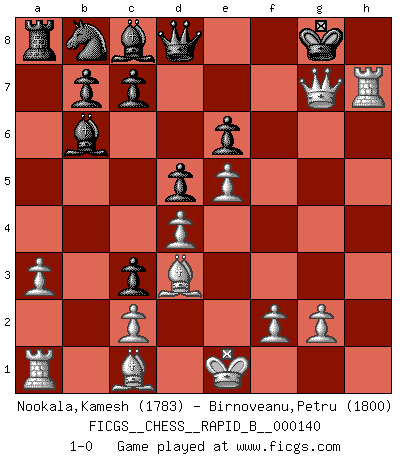 Last move : 1-0 2010 February 19 18:38:43 [Event "FICGS__CHESS__RAPID_B__000140"] [Site "FICGS"] [Date "2010.01.24"] [Round "1"] [White "Nookala,Kamesh"] [Black "Birnoveanu,Petru"] [Result "1-0"] [WhiteElo "1783"] [BlackElo "1800"] 1.e4 e6 2.d4 d5 3.Nc3 Bb4 4.e5 Ne7 5.a3 Ba5 6.Nf3 Ng6 7.b4 Bb6 8.h4 a5 9.h5 Ne7 10.h6 axb4 11.hxg7 Rg8 12.Rxh7 bxc3 13.Ng5 Ng6 14.Qh5 Ke7 15.Nxf7 Kxf7 16.Bd3 Rxg7 17.Qxg6+ Kg8 18.Qxg7+ 1-0 French : Winawer, Advance variation Player White won this chess game. Follow this game move after move (download)I prefer to lose a really good game than to win a bad one. (David Levy) Die Partien sind immer verschieden, die Interviews immer die gleichen. (Garry Kasparov) Cuando me preguntan: -¿Cual es el secreto que te hace hacer mejores movidas que tus oponentes?, Yo respondo: Me da gusto que me pregunten eso, porque, como veran, hay una simple razón. Yo pienso mis propias movidas y dejo a mi oponente que el piense las suyas. (Alexander Alekhine) Si je n'étais pas joueur d'échecs, je serais le meilleur dans quelque chose d'autre. (Anatoli Karpov) All art requires courage. (Anne Tucker)