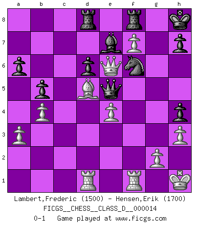 Last move : 0-1 2006 November 20 15:50:55 [Event "FICGS__CHESS__CLASS_D__000014"] [Site "FICGS"] [Date "2006.10.16"] [Round "1"] [White "Lambert,Frederic"] [Black "Hensen,Erik"] [Result "0-1"] [WhiteElo "1500"] [BlackElo "1700"] 1.e4 c5 2.Nf3 d6 3.d4 cxd4 4.Nxd4 Nf6 5.Nc3 a6 6.Bc4 e6 7.Bb3 b5 8.O-O Be7 9.Qf3 Qc7 10.Qg3 O-O 11.Bh6 Ne8 12.Rad1 Bd7 13.f4 Nc6 14.Nxc6 Bxc6 15.f5 Kh8 16.fxe6 gxh6 17.exf7 Nf6 18.a3 Rad8 19.Qf4 Bb7 20.Kh1 Qc5 21.Nd5 Bxd5 22.Bxd5 Qxc2 23.b4 h5 24.h3 h4 25.Qf5 Qb2 26.Qe6 Qe5 0-1 Comment by player 1 : Frederic Lambert : gg, very well defended, I though reaching a deadly attack after 16.fxe6 but obviously I was too naive Sicilian : Najdorf, Lipnitzky attack Kingside Castling by player White (move 8) Kingside Castling by player Black (move 10) Player Black won this chess game. Follow this game move after move (download)First-class players lose to second-class players because second-class players sometimes play a first-class game. (Siegbert Tarrasch) Die Auseinandersetzung mit Karpow war politisch geprägt. Er stand für das kommunistische System, wurde von dessen Repräsentanten gehätschelt. Ich war der Oppositionelle. Jeder Schachweltmeister spiegelt auch die gesellschaftlichen Verhältnisse wider. Kramnik steht für die Börsen-Generation des Neuen Markts, ideologiefrei, zahlenfixiert. (Garry Kasparov) No puedes jugar al Ajedrez si eres de corazón noble. (Proverbio Francés) Je ne suis pas le dernier à jouer lâchement des coups douteux pendant le zeïtnot de l'adversaire pour l'achever: en effet les coups qui font le plus peur sont ceux que l'on ne comprend pas. Je me fais souvent peur quand je joue. (Un professeur anonyme) Life is painting a picture, not doing a sum. (Oliver Wendell Holmes, Jr.)