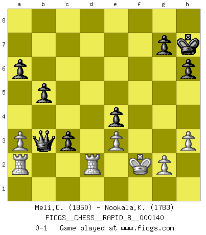 Last move : 0-1 2010 April 10 18:7:28 [Event "FICGS__CHESS__RAPID_B__000140"] [Site "FICGS"] [Date "2010.01.24"] [Round "1"] [White "Meli,Cosimo Leonardo"] [Black "Nookala,Kamesh"] [Result "0-1"] [WhiteElo "1850"] [BlackElo "1783"] 1.d4 Nf6 2.c4 e6 3.Nc3 Bb4 4.Qc2 O-O 5.a3 Bxc3+ 6.Qxc3 b6 7.Bg5 Bb7 8.e3 d6 9.Ne2 Nbd7 10.Qd3 Ba6 11.Nc3 d5 12.Qc2 Bxc4 13.Bxc4 dxc4 14.Rd1 a6 15.f3 h6 16.Bh4 Qb8 17.Kf2 b5 18.Rhe1 c5 19.Kg1 Qb7 20.Rf1 Nd5 21.Qd2 cxd4 22.Qxd4 Nxc3 23.bxc3 Nb6 24.Rf2 Na4 25.Rfd2 Qd5 26.Rc2 Rfe8 27.Kf1 Qh5 28.h3 e5 29.Qe4 f5 30.Qd5+ Kh7 31.Be1 Rac8 32.Kg1 Nc5 33.Bf2 Rcd8 34.Qxd8 Rxd8 35.Rxd8 Nd3 36.Rd2 e4 37.fxe4 fxe4 38.Kf1 Qc5 39.Ra2 Qc7 40.Rd5 Qa5 41.Be1 Nxe1 42.Kxe1 Qxc3+ 43.Kf2 Qb3 44.R5d2 c3 0-1 Nimzo-Indian : Classical variation Kingside Castling by player Black (move 4) Player Black won this chess game. Follow this game move after move (download)Chess mastery essentially consists of analyzing Chess positions accurately. (Mikhail Botvinnik) Meine Liebe ist Schach, Schach, Schach. Ich muss jeden Tag Schach spielen, deshalb fühle ich mich so stark. (Miguel Najdorf) Yo creo que el Ajedrez posee una magia que es también una ayuda en la edad avanzada. Una rodilla reumática es olvidada durante una partida de Ajedrez y otros eventos pueden parecer algo sin importancia comparada a una catástrofe en el tablero de Ajedrez. (Vlastimil Hort) L'attaque fait le spectacle, la défense gagne les matchs. (Dicton footballistique) Lottery : A tax on people who are bad at math. (Author unknown)