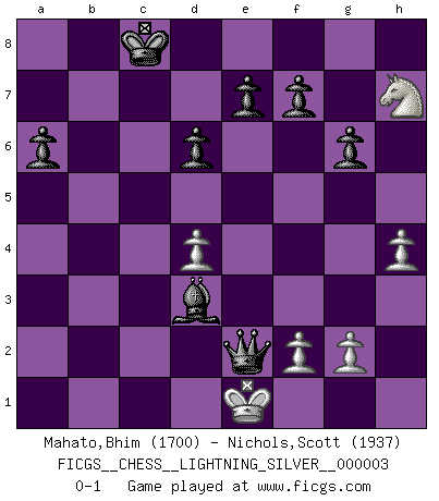 Last move : 0-1 2010 January 24 20:32:42 [Event "FICGS__CHESS__LIGHTNING_SILVER__000003"] [Site "FICGS"] [Date "2010.01.24"] [Round "1"] [White "Mahato,Bhim"] [Black "Nichols,Scott"] [Result "0-1"] [WhiteElo "1700"] [BlackElo "1937"] 1.e4 d6 2.d4 Nf6 3.Nc3 g6 4.Be3 a6 5.Be2 Bg7 6.e5 Nfd7 7.exd6 cxd6 8.Qd2 Nf6 9.Bh6 Bxh6 10.Qxh6 Nc6 11.O-O-O Bf5 12.Nf3 Qa5 13.Ng5 Nb4 14.Bc4 Kd7 15.Bb3 Rhc8 16.Rhe1 Rxc3 17.bxc3 Nxa2+ 18.Kb2 Nxc3 19.Ra1 Qb4 20.Nxh7 Nfd5 21.Qd2 Rc8 22.Kc1 Na2+ 23.Rxa2 Qxb3 24.Rb2 Qa3 25.Re2 Rc6 26.Kb1 Nc3+ 27.Qxc3 Rxc3 28.Rxb7+ Kc8 29.Rb2 Qa4 30.Kc1 Ra3 31.Rb1 Ra2 32.Kd1 Bxc2+ 33.Ke1 Bxb1 34.Rxa2 Qxa2 35.h4 Bd3 36.Kd1 Qc2+ 37.Ke1 Qe2+ 0-1 Pirc defense Queenside Castling by player White (move 11) Player Black won this chess game. Follow this game move after move (download)Chess is imagination. (David Bronstein) Über Frauen: Chess is better. (Robert James Fischer) Uno por uno, yo los acribillé, mi superioridad muy pronto se volvio aparente. (Jose Capablanca) Les réformistes prétendent que les progrès de la théorie conduiront à la disparition des échecs, et qu'il faut, pour leur rendre vie, en remanier les règles. En réalité, qu'exprime cette affirmation? Le mépris de l'intuition, de l'imagination et de tous les autres éléments qui font des échecs un art. (Alexander Alekhine) A good book on your shelf is a friend that turns its back on you and remains a friend. (Author unknown)
