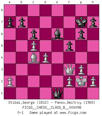 Last move : 0-1 2010 April 22 10:45:33 [Event "FICGS__CHESS__CLASS_B__000098"] [Site "FICGS"] [Date "2010.01.26"] [Round "1"] [White "Stibal,George"] [Black "Panov,Dmitriy"] [Result "0-1"] [WhiteElo "1812"] [BlackElo "1965"] 1.e4 e5 2.Nf3 Nf6 3.d4 Nxe4 4.Bd3 d5 5.Nxe5 Nd7 6.Nxd7 Bxd7 7.O-O Bd6 8.Nc3 Nxc3 9.bxc3 O-O 10.Qh5 f5 11.Re1 g6 12.Qf3 c6 13.Bf4 Qc7 14.Bxd6 Qxd6 15.c4 Rae8 16.c5 Qc7 17.c4 Qa5 18.Rxe8 Rxe8 19.Bf1 dxc4 20.Bxc4+ Kg7 21.g3 Re1+ 22.Rxe1 Qxe1+ 23.Kg2 Be6 0-1 Petrov : Modern attack, Symmetrical variation Kingside Castling by player White (move 7) Kingside Castling by player Black (move 9) Player Black won this chess game. Follow this game move after move (download)The tactician knows what to do when there is something to do; whereas the strategian knows what to do when there is nothing to do. (Gerald Abrahams) Gewöhnliche Menschen denken nur daran, wie sie ihre Zeit verbringen. Ein intelligenter Mensch versucht, sie auszunutzen. (Arthur Schopenhauer) Un sacrificio se refuta mucho mejor al aceptarlo. (Wilhelm Steinitz) Celui qui prend des risques peut perdre, celui qui n'en prend pas perd toujours. (Xavier Tartacover) Sometimes it pays to stay in bed in Monday, rather than spending the rest of the week debugging Monday's code. (Dan Salomon)