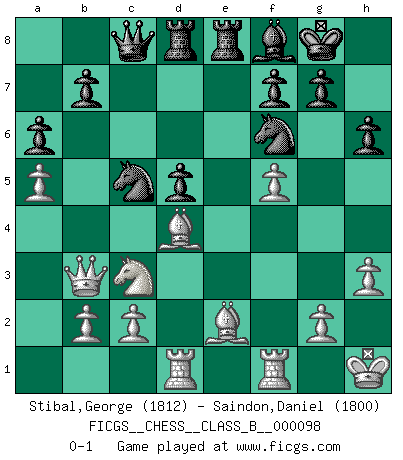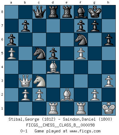 Last move : 0-1 2010 April 23 0:40:28 [Event "FICGS__CHESS__CLASS_B__000098"] [Site "FICGS"] [Date "2010.01.26"] [Round "1"] [White "Stibal,George"] [Black "Saindon,Daniel"] [Result "0-1"] [WhiteElo "1812"] [BlackElo "1800"] 1.e4 c5 2.Nf3 d6 3.d4 cxd4 4.Nxd4 Nf6 5.Nc3 a6 6.f4 Qc7 7.Be2 e5 8.Nf5 Bxf5 9.exf5 Nc6 10.O-O Rd8 11.Be3 d5 12.fxe5 Nxe5 13.Qd4 Be7 14.Qb6 Qc8 15.Rad1 O-O 16.Bd4 Rfe8 17.Kh1 Bd6 18.a4 Bf8 19.a5 h6 20.h3 Ned7 21.Qb3 Nc5 0-1 Sicilian : Najdorf, 6.f4 Kingside Castling by player White (move 10) Kingside Castling by player Black (move 15) Player Black won this chess game. Follow this game move after move (download)Chess holds its master in its own bonds, shackling the mind and brain so that the inner freedom of the very strongest must suffer. (Albert Einstein) Wie kann ich Remis annehmen? Ich weiß ja gar nicht, wie ich stehe! (Fritz Sämisch) El Ajedrez es el juego mas altamente simbólico, pero las agresiones estan por lo tanto aún mas francamente representadas en la partida. Tal vez comenzo como un juego de guerra; Algo como la representación de una batalla en miniatura entre las fuerzas de dos reinos. (Karl Meninger) Le joueur d'Echecs qui veut atteindre le top est obligé de développer son propre credo créatif. Alexeï Stepanovicth Souétine. Il est facile d'écrire des livres ! Ce qui est difficile, c'est de jouer ! (Alexeï Stepanovicth Souétine) Whatever you do, don't be bored. This is absolutely the most exciting time we could have possibly hoped to be alive. And things are just starting. (From movie Waking life)
