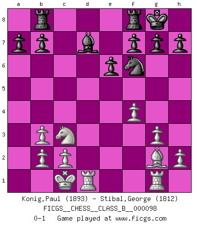 Last move : 0-1 2010 March 28 23:47:55 [Event "FICGS__CHESS__CLASS_B__000098"] [Site "FICGS"] [Date "2010.01.26"] [Round "1"] [White "Konig,Paul"] [Black "Stibal,George"] [Result "0-1"] [WhiteElo "1893"] [BlackElo "1812"] 1.e4 c5 2.f4 d5 3.exd5 Qxd5 4.Nc3 Qd8 5.Nf3 Nf6 6.d4 e6 7.Be3 cxd4 8.Qxd4 Qxd4 9.Nxd4 Bc5 10.O-O-O O-O 11.g3 Bd7 12.Bg1 Nc6 13.Bg2 Na5 14.Nb3 Nxb3+ 15.axb3 Bxg1 16.Rhxg1 Rab8 0-1 Sicilian : Grand Prix attack Queenside Castling by player White (move 10) Kingside Castling by player Black (move 10) Player Black won this chess game. Follow this game move after move (download)Every Chess master was once a beginner. (Chernev) Frage: Was machen Sie mit den Preisen? Anwort: Ich habe Angst, dass meine Freundin davon neue Kleider kauft. (Loek van Wely) Uno por uno, yo los acribillé, mi superioridad muy pronto se volvio aparente. (Jose Capablanca) Les Echecs mettent en conflit, non pas deux intelligences, mais deux volontés. (Lasker) When you don't know what to do, walk fast and look worried. (Anonymous)