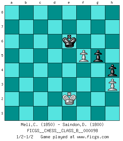 Last move : 1/2-1/2 2010 October 8 21:43:34 [Event "FICGS__CHESS__CLASS_B__000098"] [Site "FICGS"] [Date "2010.01.26"] [Round "1"] [White "Meli,Cosimo Leonardo"] [Black "Saindon,Daniel"] [Result "1/2-1/2"] [WhiteElo "1850"] [BlackElo "1800"] 1.d4 Nf6 2.c4 g6 3.g3 c5 4.d5 b5 5.cxb5 a6 6.bxa6 d6 7.Bg2 Bg7 8.Nc3 O-O 9.Nf3 Nbd7 10.O-O Nb6 11.Re1 Bxa6 12.Bf4 Nh5 13.Bg5 h6 14.Bc1 Nf6 15.h3 Qc7 16.Nd2 Rfb8 17.Rb1 Qb7 18.b4 Nfd7 19.bxc5 Nxc5 20.Bb2 Nc4 21.Ba1 Qc7 22.Rxb8+ Rxb8 23.Nxc4 Bxc4 24.Qc2 Qa5 25.Rc1 Ba6 26.Qd2 Rb4 27.e3 Rc4 28.Rc2 Nd7 29.Bf1 Rc5 30.e4 Nb6 31.Bxa6 Qxa6 32.Rc1 Qc8 33.Kh2 Na4 34.Ne2 Bxa1 35.Rxa1 Rc2 36.Qe3 Qc4 37.Re1 Nc5 38.Kg1 Qb4 39.Rc1 Rxa2 40.e5 Qd2 41.Qxd2 Rxd2 42.exd6 exd6 43.Nc3 Kg7 44.Kf1 Nd3 45.Ne4 Rxf2+ 46.Nxf2 Nxc1 47.Ne4 Na2 48.Nxd6 Kf6 49.Nc4 Nb4 50.d6 Ke6 51.Ke2 Nc6 52.Ke3 Kd5 53.Kd3 Nd8 54.d7 Ke6 55.Nb6 Kd6 56.Ke4 Ne6 57.Nc4+ Kxd7 58.Ke5 Ke7 59.Nb6 f6+ 60.Kd5 Nc7+ 61.Kc6 Ne8 62.Kd5 h5 63.g4 h4 64.Na8 Kf7 65.Nb6 Nc7+ 66.Kc4 Ne6 67.Nd5 Ng5 68.Nf4 Nf3 69.Ne2 Ke6 70.Nf4+ Kd6 71.Kd3 g5 72.Ne2 Ke5 73.Ke3 Ne1 74.Kf2 Nd3+ 75.Ke3 Nb4 76.Nc3 Nd5+ 77.Nxd5 Kxd5 78.Kf3 Ke5 79.Ke3 Kd6 80.Kf2 Ke6 81.Ke2 f5 82.gxf5+ 1/2-1/2 King's Indian : 3.g3 Kingside Castling by player Black (move 8) Kingside Castling by player White (move 10) 10 pieces endgame at move 48 : White KNPPP , Black KNPPP WHITE : King + 1 Knight 3 Pawns BLACK : King + 1 Knight 3 Pawns 9 pieces endgame at move 57 : White KNPP , Black KNPPP WHITE : King + 1 Knight 2 Pawns BLACK : King + 1 Knight 3 Pawns 8 pieces endgame at move 77 : White KNPP , Black KPPP WHITE : King + 1 Knight 2 Pawns BLACK : King + 3 Pawns 7 pieces endgame at move 77 : White KPP , Black KPPP WHITE : King + 2 Pawns BLACK : King + 3 Pawns 6 pieces endgame at move 82 : White KPP , Black KPP WHITE : King + 2 Pawns BLACK : King + 2 Pawns This chess game ended in a draw. Follow this game move after move (download)Chess, like any creative activity, can exist only through the combined efforts of those who have creative talent, and those who have the ability to organize their creative work. (Mikhail Botvinnik) Bis jetzt ist Weiß einer wohlbekannten Analyse gefolgt. Aber jetzt begeht er einen schrecklichen Fehler: Er beginnt seinen eigenen Kopf zu benutzen. (Siegbert Tarrasch) Tu eres para mi la Reina en d8 y yo soy el Peón en d7!!. (GM Eduard Gufeld) Les échecs sont utiles à l'exercice de la faculté de penser et à celle de l'imagination. Car nous devons posséder une méthode élaborée pour atteindre des buts partout où nous devons conduire notre raison. (Leibnitz) The arrogant army will lose certainly the battle. (Chinese proverb)
