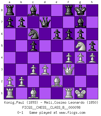 Last move : 0-1 2010 March 22 5:49:37 [Event "FICGS__CHESS__CLASS_B__000098"] [Site "FICGS"] [Date "2010.01.26"] [Round "1"] [White "Konig,Paul"] [Black "Meli,Cosimo Leonardo"] [Result "0-1"] [WhiteElo "1893"] [BlackElo "1850"] 1.e4 c5 2.f4 d5 3.exd5 Nf6 4.Nc3 Nxd5 5.Nxd5 Qxd5 6.Qf3 Qe6+ 7.Be2 Nc6 8.c3 g6 9.Nh3 Bg7 10.Ng5 Qd7 11.O-O O-O 12.h4 h5 13.d3 e6 14.g4 f6 0-1 Sicilian : Grand Prix attack Kingside Castling by player White (move 11) Kingside Castling by player Black (move 11) Player Black won this chess game. Follow this game move after move (download)When you see a good move, look for a better one. (Emanuel Lasker) Der Freibauer hat für mich eine Seele, genau wie der Mensch, Wünsche, die unerkannt in ihm schlummern, und Befürchtungen, von deren Existenz er selbst kaum ahnt. (Aaron Nimzowitsch) El jugador táctico sabe que hacer cuando hay algo que hacer; mientras que el estratega sabe que hacer cuando no hay nada que hacer. (Gerald Abrahams) Avant la finale, les dieux ont créé le milieu de partie. (Tarrasch) Train yourself to let go of everything you fear to lose. (Master Yoda in Star Wars ep.3)