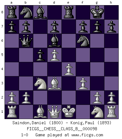 Last move : 1-0 2010 March 23 4:54:22 [Event "FICGS__CHESS__CLASS_B__000098"] [Site "FICGS"] [Date "2010.01.26"] [Round "1"] [White "Saindon,Daniel"] [Black "Konig,Paul"] [Result "1-0"] [WhiteElo "1800"] [BlackElo "1893"] 1.d4 Nf6 2.Bg5 Ne4 3.Bf4 c5 4.f3 Qa5+ 5.c3 Nf6 6.d5 Qb6 7.Bc1 e6 8.c4 Bd6 9.Nc3 O-O 10.e4 Re8 11.Bd3 exd5 12.cxd5 1-0 Trompowsky attack (Ruth, Opovcensky Opening) Kingside Castling by player Black (move 9) Player White won this chess game. Follow this game move after move (download)Human affairs are like a Chess game: only those who do not take it seriously can be called good players. (Hung Tzu Ch'eng) Der zweitbeste Zug ist oft der einzig richtige. (Savielly Grigorievitsch Tartakower) Si tu oponente te ofrece un empate, trata de averiguar porque piensa él que esta en una posición peor. (Nigel Short) Le profane ne songe pas à la somme de jouissance dont il se prive, qui méconnaît ce jeu aux ressources aussi variées que passionnantes. (Jean-Marie Jeanton-Lamarche) A belief is an idea the mind possesses, an idea that possesses the mind. (Robert Oxden Bolton)