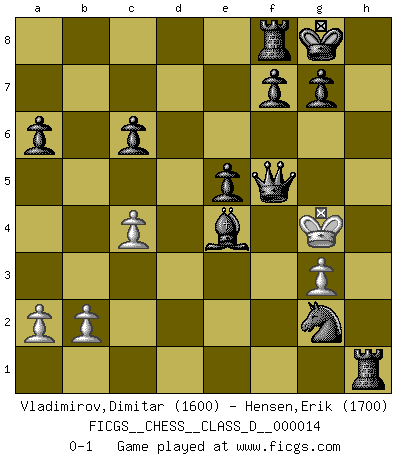Last move : 0-1 2006 December 7 13:1:30 [Event "FICGS__CHESS__CLASS_D__000014"] [Site "FICGS"] [Date "2006.10.16"] [Round "1"] [White "Vladimirov,Dimitar"] [Black "Hensen,Erik"] [Result "0-1"] [WhiteElo "1600"] [BlackElo "1700"] 1.e4 c5 2.Nf3 d6 3.Bc4 e6 4.Nc3 Nf6 5.O-O Be7 6.d4 cxd4 7.Nxd4 a6 8.Re1 O-O 9.e5 dxe5 10.Rxe5 Qc7 11.Qe2 Bd6 12.Re3 Bxh2+ 13.Kh1 Bf4 14.Rh3 Bxc1 15.Rxc1 e5 16.Nd5 Nxd5 17.Rxh7 Kxh7 18.Qh5+ Kg8 19.Bd3 Nf6 20.Nf3 Nxh5 21.Re1 Nc6 22.Re4 Nf4 23.Bf1 Bf5 24.Rc4 Rad8 25.g3 Ng6 26.Bg2 Rd1+ 27.Kh2 Qb6 28.Rxc6 bxc6 29.Ng1 Qxf2 30.Nf3 Be4 31.Nh4 Nxh4 32.Kh3 Nxg2 33.c4 Rh1+ 34.Kg4 Qf5+ 0-1 Sicilian Kingside Castling by player White (move 5) Kingside Castling by player Black (move 8) Player Black won this chess game. Follow this game move after move (download)It is peculiar but a fact nevertheless, that gamblers in chess always have enthusiastic followers. (Botvinnik) Ich hatte meine größten Erfolge, als ich 47 Jahre alt war. Kasparow war noch nicht mal 42 und hat das Schach schon im Stich gelassen. (Viktor Kortschnoi) Un Peón pasado es un criminal, quién debe ser mantenido bajo candado y llave. Leves medidas, tales como vigilancia policiaca, no son suficientes. (Aaron Nimzovich) Shah mat. Le roi est mort. Cri de fierté d'un joueur venant de terrasser son adversaire, courtoisement, sans effusion de sang. The Internet is the world's largest library. It's just that all the books are on the floor. (John Allen Paulos)