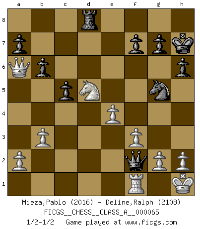 Last move : 1/2-1/2 2010 February 12 5:52:26 [Event "FICGS__CHESS__CLASS_A__000065"] [Site "FICGS"] [Date "2010.01.27"] [Round "1"] [White "Mieza,Pablo"] [Black "Deline,Ralph"] [Result "1/2-1/2"] [WhiteElo "2016"] [BlackElo "2108"] 1.d4 Nf6 2.c4 e6 3.Nf3 d5 4.Nc3 Be7 5.Bg5 O-O 6.e3 h6 7.Bxf6 Bxf6 8.Rc1 c6 9.Bd3 dxc4 10.Bxc4 Nd7 11.O-O e5 12.Ne4 exd4 13.Nxd4 Qe7 14.Nxf6+ Nxf6 15.Qb3 c5 16.Ne2 Bf5 17.Rfd1 Rad8 18.Qa3 b6 19.f3 Be6 20.Bxe6 Qxe6 21.e4 Rd7 22.Rxd7 Qxd7 23.Nc3 Qd4+ 24.Kh1 Qf2 25.Rb1 Ra8 26.Qa4 Nh7 27.Nd5 Ng5 28.Qa6 Kh7 29.b3 Rd8 30.Rf1 1/2-1/2 Queen's pawn game Kingside Castling by player Black (move 5) Kingside Castling by player White (move 11) This chess game ended in a draw. Follow this game move after move (download)In order to improve your game, you must study the endgame before everything else, for whereas the endings can be studied and mastered by themselves, the middle game and the opening must be studied in relation to the endgame. (Jose Raul Capablanca) Ohne Fehler kann es keine Brillanz geben. (Emanuel Lasker) Después de una mala apertura, hay una esperanza en el juego medio. Pero una vez que estas en finales, el momento de la verdad ha llegado. (Edmar Mednis) Mais l'homme est une créature légère et illogique : semblable au joueur d'échecs, il n'aime que le processus du but à atteindre, non le but lui-même. (Dostoïevsky) Nobody is always a winner, and anybody who says he is, is either a liar or doesn't play poker. (Amarillo Slim)