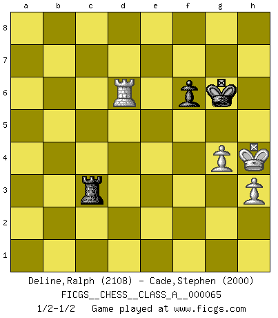 Last move : 1/2-1/2 2010 April 19 12:19:1 [Event "FICGS__CHESS__CLASS_A__000065"] [Site "FICGS"] [Date "2010.01.27"] [Round "1"] [White "Deline,Ralph"] [Black "Cade,Stephen"] [Result "1/2-1/2"] [WhiteElo "2108"] [BlackElo "2000"] 1.e4 c5 2.c3 d5 3.exd5 Qxd5 4.d4 Nf6 5.Nf3 e6 6.Be2 Be7 7.c4 Qd8 8.Nc3 O-O 9.O-O cxd4 10.Qxd4 Bd7 11.Bf4 Nc6 12.Qd2 Bb4 13.Rad1 Qa5 14.Bg5 Bxc3 15.bxc3 Ne4 16.Qxd7 Nxg5 17.Nxg5 Qxg5 18.Qxb7 Rfc8 19.Rd6 Qe5 20.Rxc6 Rcb8 21.Qa6 Qxe2 22.Rc7 h6 23.h3 Qd3 24.Qc6 Qxc3 25.c5 a5 26.Qd6 Rb2 27.Qf4 Qf6 28.Qxf6 gxf6 29.a4 Rb4 30.c6 Rd8 31.Ra7 Rc8 32.c7 Kf8 33.Ra1 Ke7 34.g4 Rc4 35.Rxa5 R4xc7 36.Ra2 Rg8 37.Kh2 Rb8 38.Rh5 Ra7 39.Rxh6 Rb4 40.a5 Rb5 41.Rh5 e5 42.a6 Rb6 43.f4 R7xa6 44.Rxa6 Rxa6 45.fxe5 Ra2+ 46.Kg3 Ra3+ 47.Kg2 Ra2+ 48.Kf3 Ra3+ 49.Kf4 Ra4+ 50.Kg3 Ra3+ 51.Kh4 fxe5 52.Rxe5+ Kf6 53.Rc5 Kg6 54.Rc4 f6 55.Rd4 Rc3 56.Rd6 1/2-1/2 Sicilian : Alapin's variation (2.c3) Kingside Castling by player Black (move 8) Kingside Castling by player White (move 9) 10 pieces endgame at move 44 : White KRPPP , Black KRPPP WHITE : King + 1 Rook 3 Pawns BLACK : King + 1 Rook 3 Pawns 9 pieces endgame at move 45 : White KRPPP , Black KRPP WHITE : King + 1 Rook 3 Pawns BLACK : King + 1 Rook 2 Pawns 8 pieces endgame at move 51 : White KRPP , Black KRPP WHITE : King + 1 Rook 2 Pawns BLACK : King + 1 Rook 2 Pawns 7 pieces endgame at move 52 : White KRPP , Black KRP WHITE : King + 1 Rook 2 Pawns BLACK : King + 1 Rook 1 Pawn This chess game ended in a draw. Follow this game move after move (download)I am still a victim of Chess. It has all the beauty of art and much more. It cannot be commercialized. Chess is much purer than art in its social position. (Marcel Duchamp) Rauchen ist dem Schachspieler bei seiner Arbeit, also im Wettkampf, untersagt. (Viktor Kortschnoi) Fischer es el jugador mas fuerte del mundo. De hecho, el jugador mas fuerte que jamas haya existido. (Larry Evans) Karpov est une pièce de musée. (Garry Kasparov) Luck is when opportunity knocks and you answer. (Anonymous)