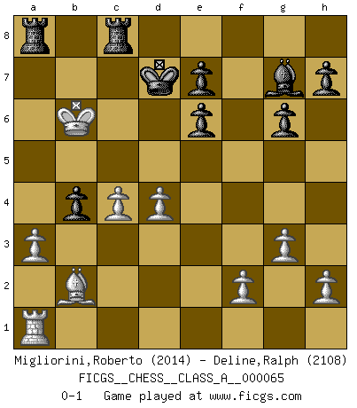 Last move : 0-1 2010 March 8 21:19:40 [Event "FICGS__CHESS__CLASS_A__000065"] [Site "FICGS"] [Date "2010.01.27"] [Round "1"] [White "Migliorini,Roberto"] [Black "Deline,Ralph"] [Result "0-1"] [WhiteElo "2014"] [BlackElo "2108"] 1.b3 Nf6 2.Nf3 g6 3.Bb2 Bg7 4.g3 c5 5.c4 d6 6.d4 Ne4 7.Bg2 Qa5+ 8.Nbd2 Nc6 9.e3 O-O 10.a3 Nxd2 11.Qxd2 Qxd2+ 12.Kxd2 Na5 13.Kc3 Be6 14.Nd2 cxd4+ 15.exd4 Rac8 16.Kb4 Nc6+ 17.Bxc6 a5+ 18.Kxa5 bxc6 19.Rhe1 c5 20.Kb6 Rb8+ 21.Ka7 Ra8+ 22.Kb6 Rfb8+ 23.Kc6 Rc8+ 24.Kb7 Kf8 25.Rxe6 fxe6 26.b4 Ke8 27.Nb3 Kd7 28.Nxc5+ dxc5 29.Kb6 cxb4 0-1 Nimzovich-Larsen attack : Indian variation Kingside Castling by player Black (move 9) Player Black won this chess game. Follow this game move after move (download)My opponents make good moves too. Sometimes I don't take these things into consideration. (Bobby Fischer) Das Schachspiel übertrifft alle anderen Spiele so weit wie der Chimborasso einen Misthaufen. (Arthur Schopenhauer) La táctica fluye a partir de una posición superior. (Bobby Fischer) La vie est comme un jeu d'échecs : nous esquissons un plan, mais celui-ci est tributaire de ce que daignent faire l'adversaire aux échecs et le destin dans la vie. (Arthur Schopenhauer) Ah, beer! The cause of, and the solution to, all of life's problems. (Homer Simpson)